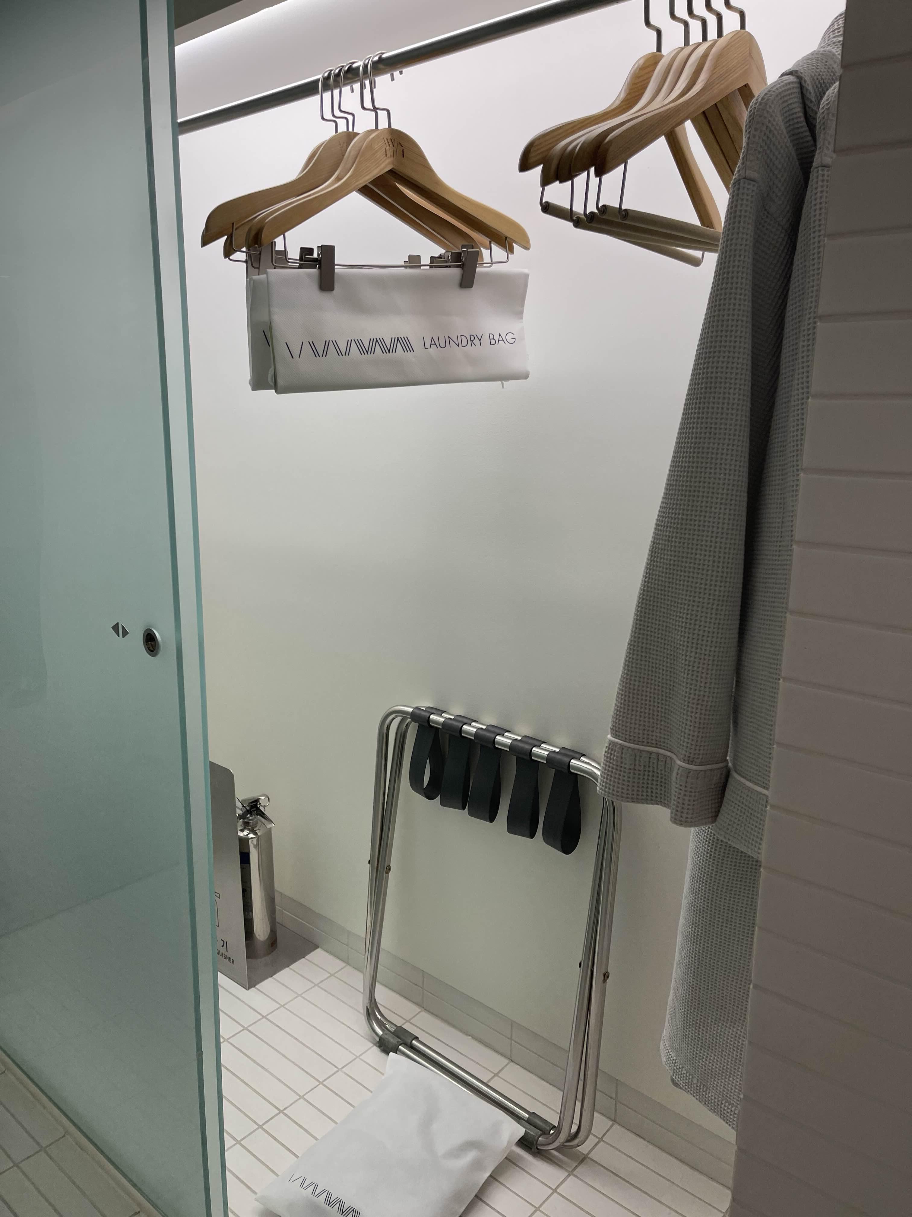 옷장 안에는 소화기, 다리미, 구두주걱, 샤워가운, 옷걸이가 있어요.