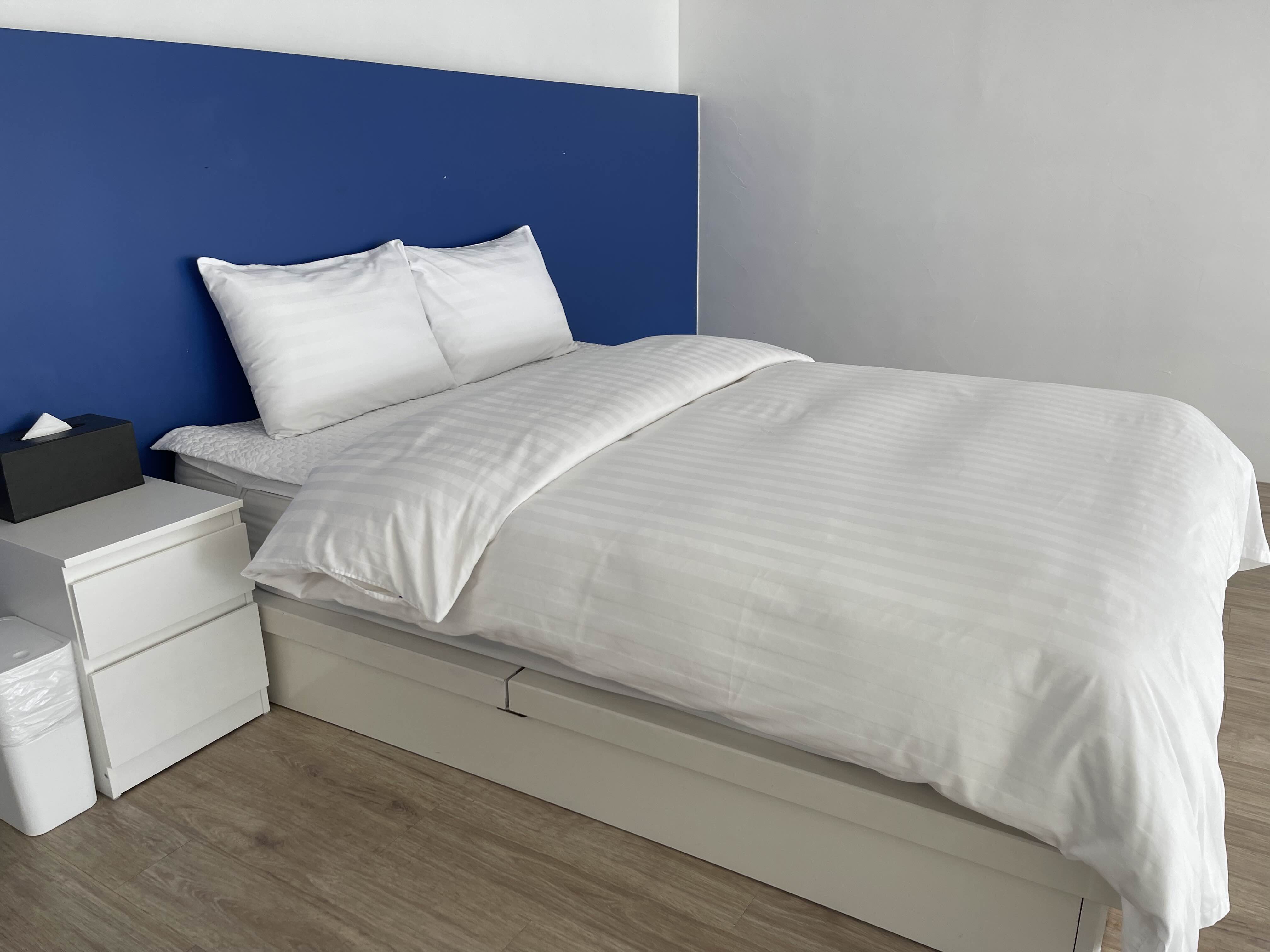 침대, 협탁, 티슈 쓰레기통 똭 간결하게 있어요.
