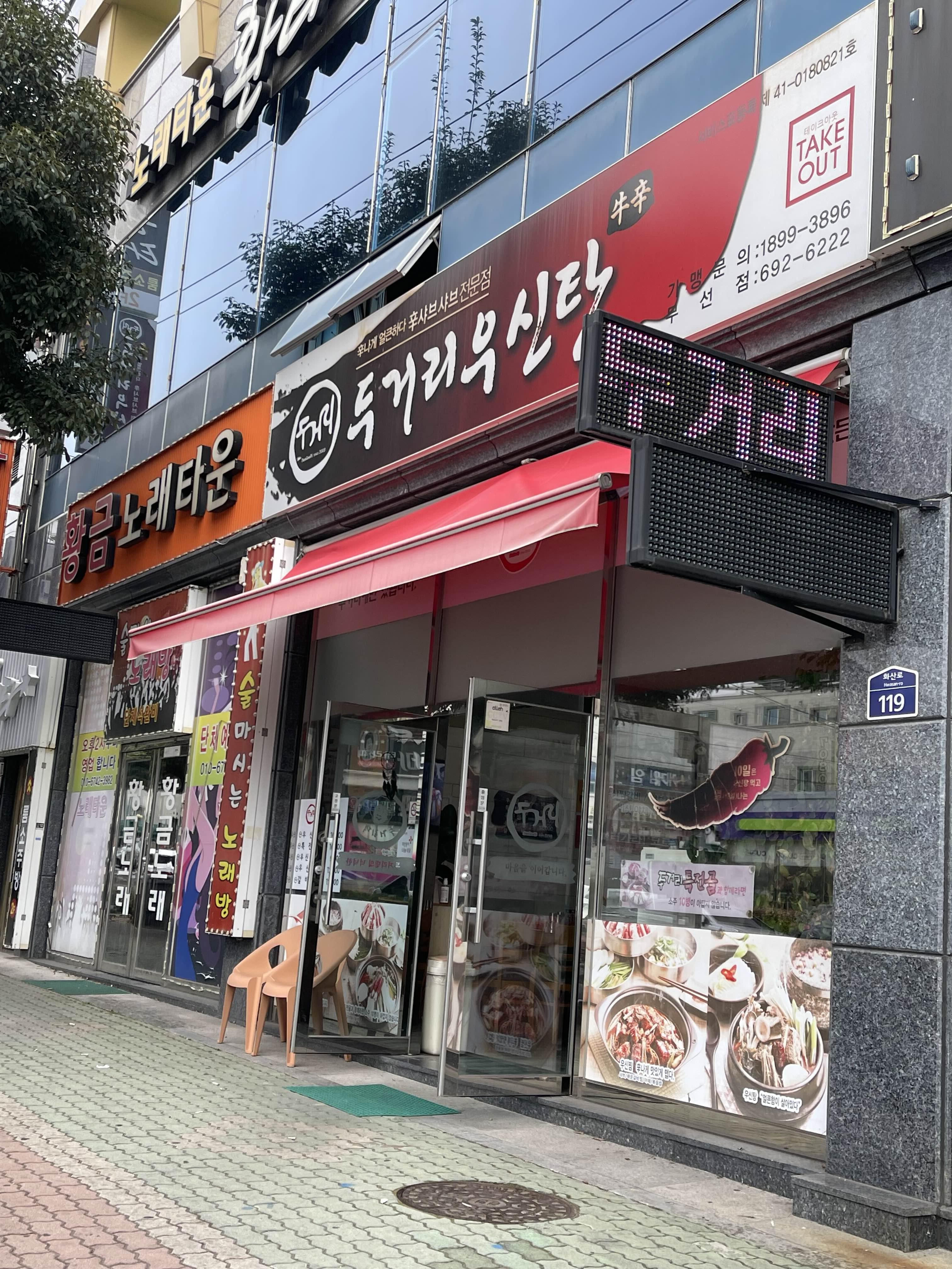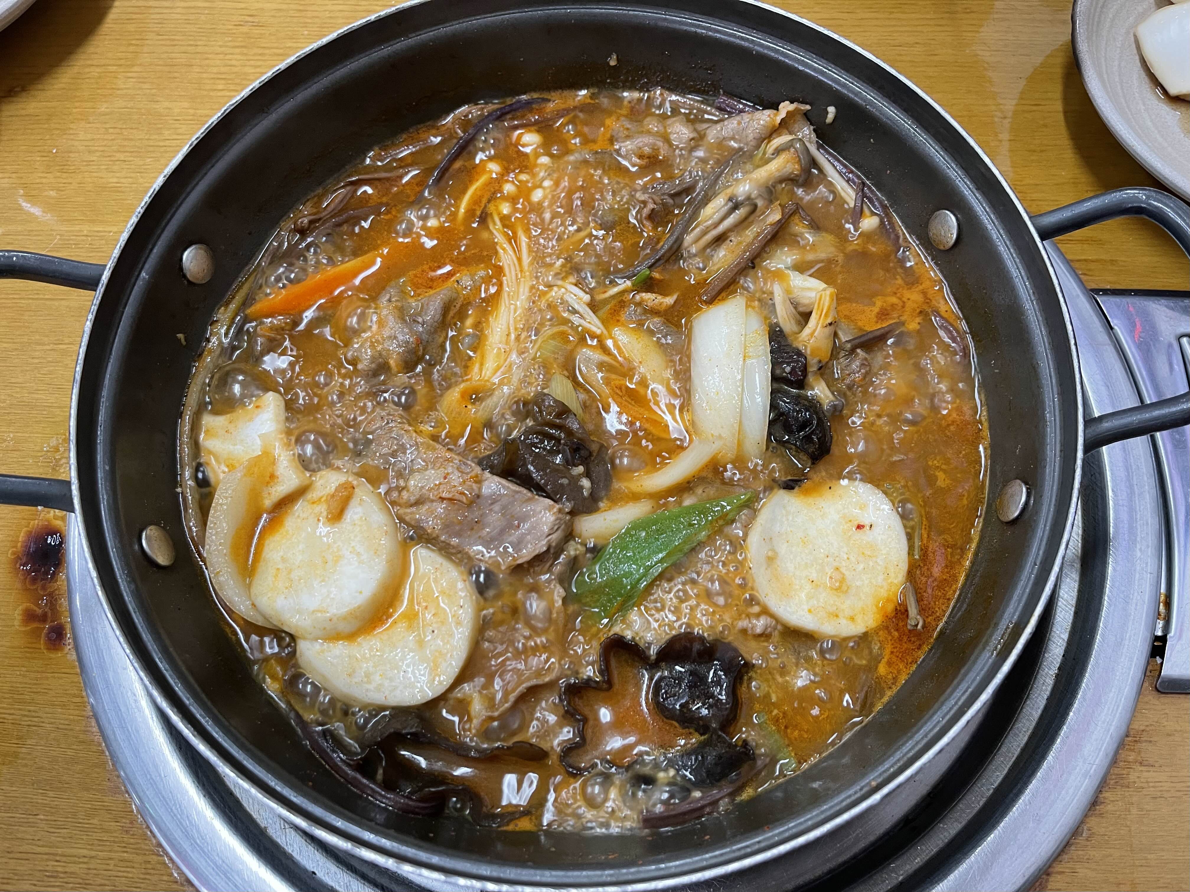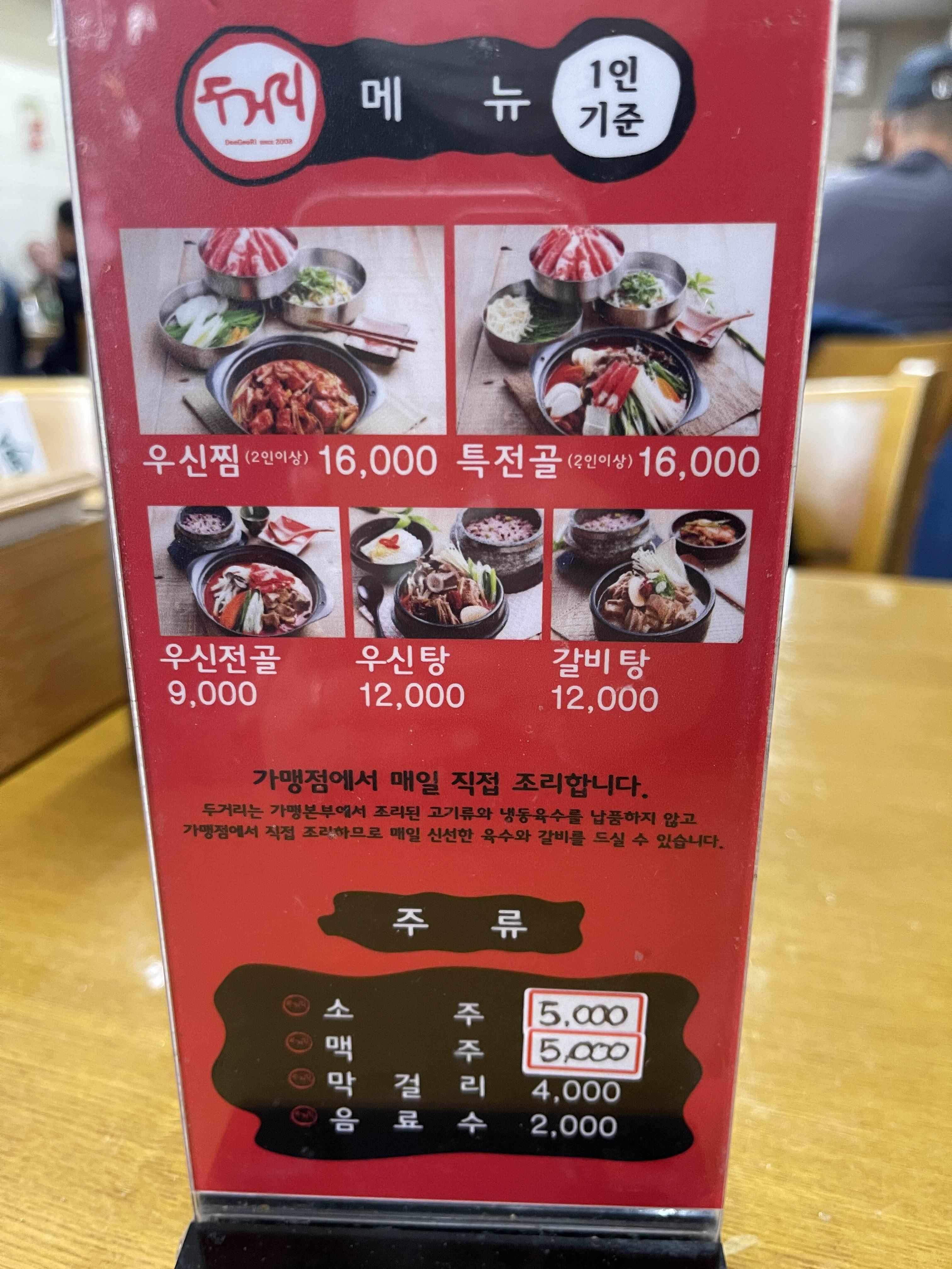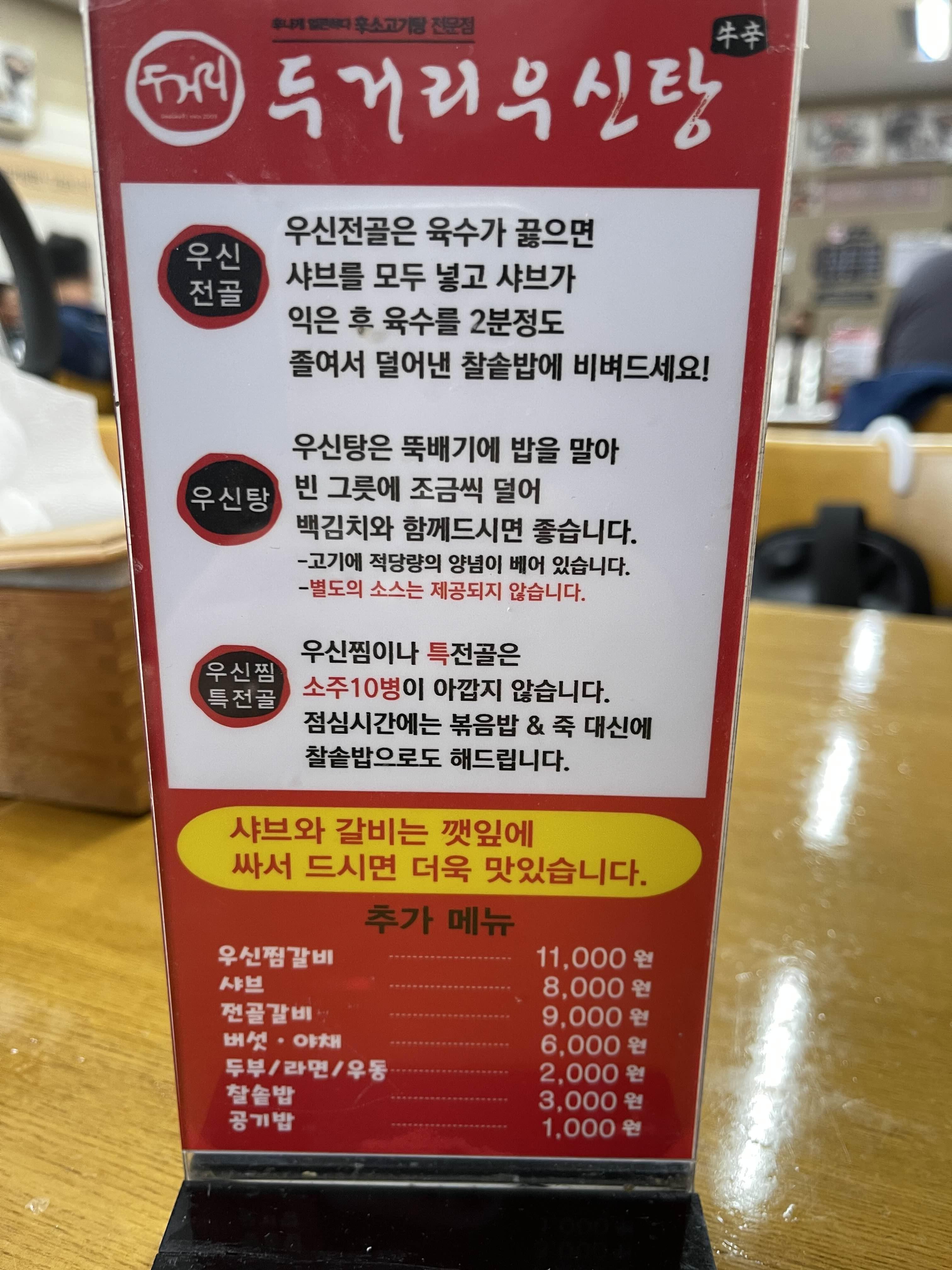 우신탕은 1인 뚝배기로 나오는 메뉴고 전골은 전골냄비에 나오는 메뉴였어요.