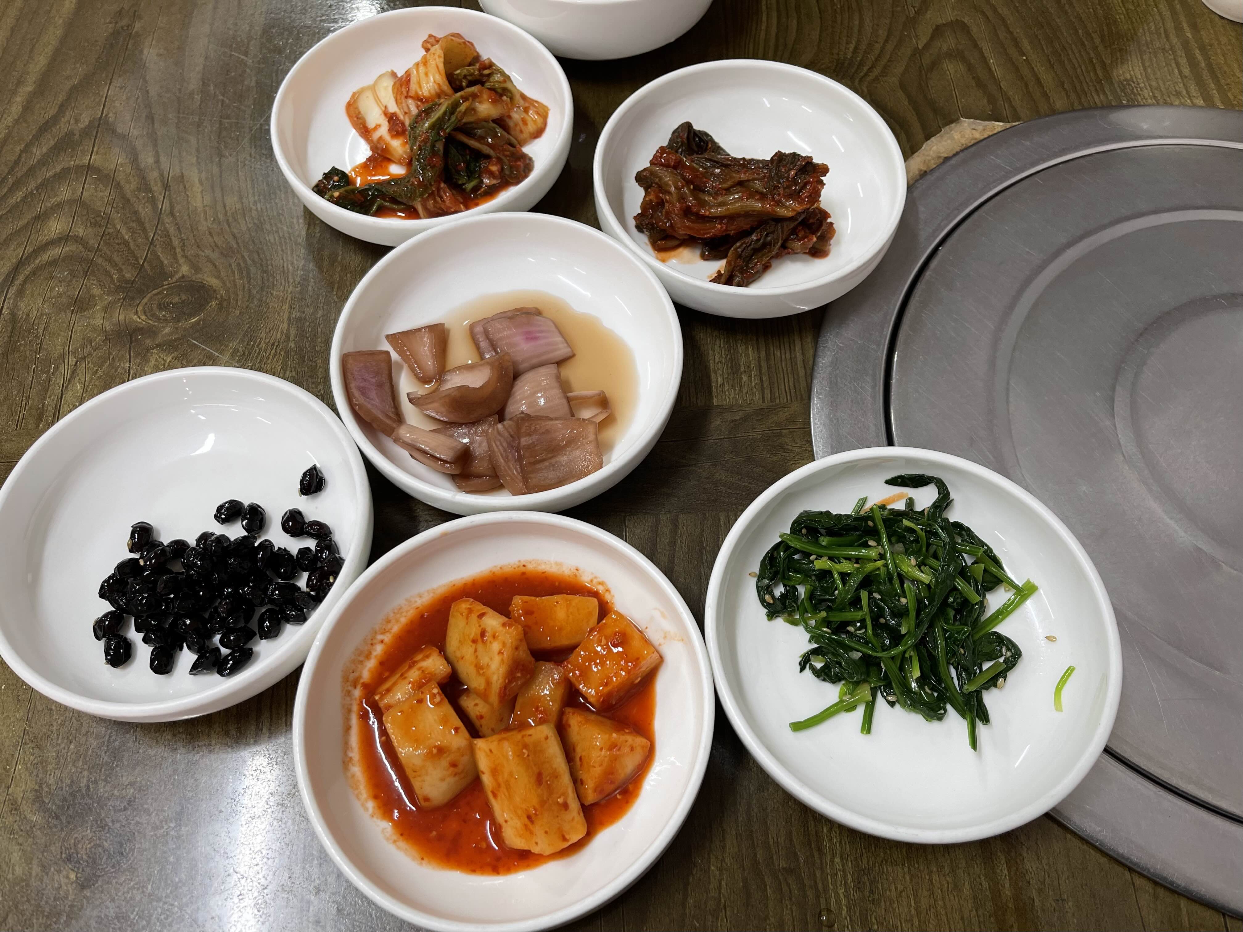 김치, 갓김치, 양파장아찌, 콩자반, 깍두기, 뭔지모를 나물(?)