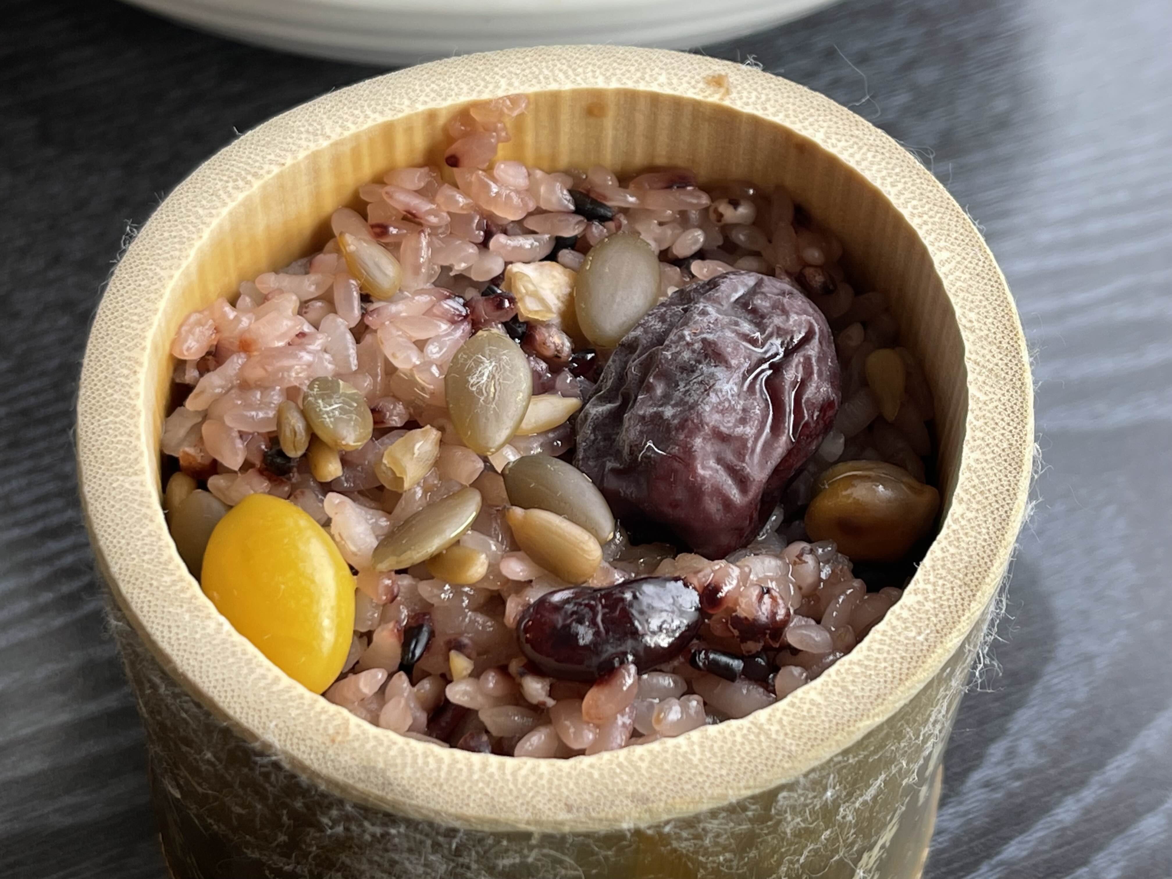 대추, 은행, 잣, 호박씨 등등 쫜득한 찰밥이 대나무통에 들어있어요.