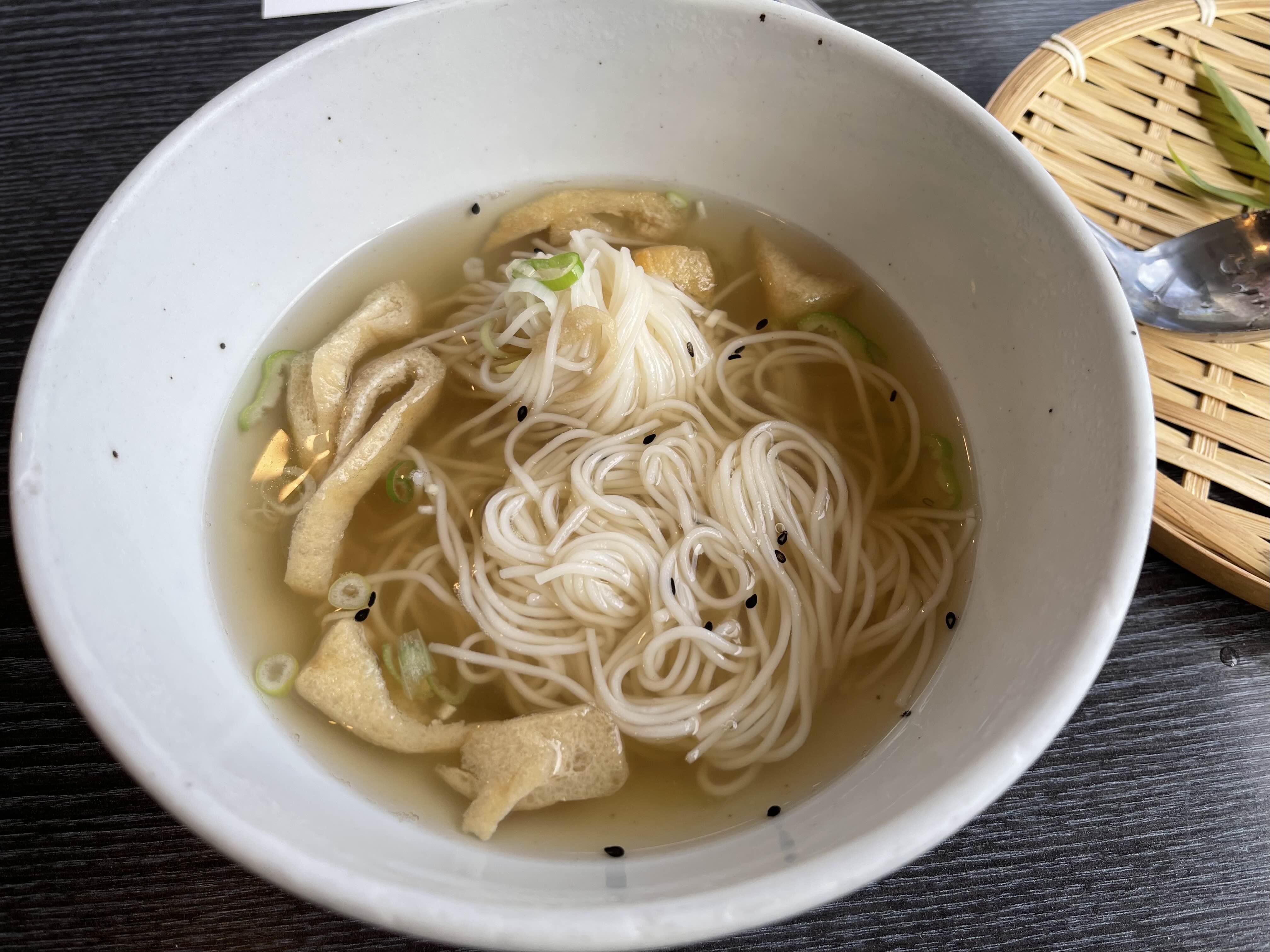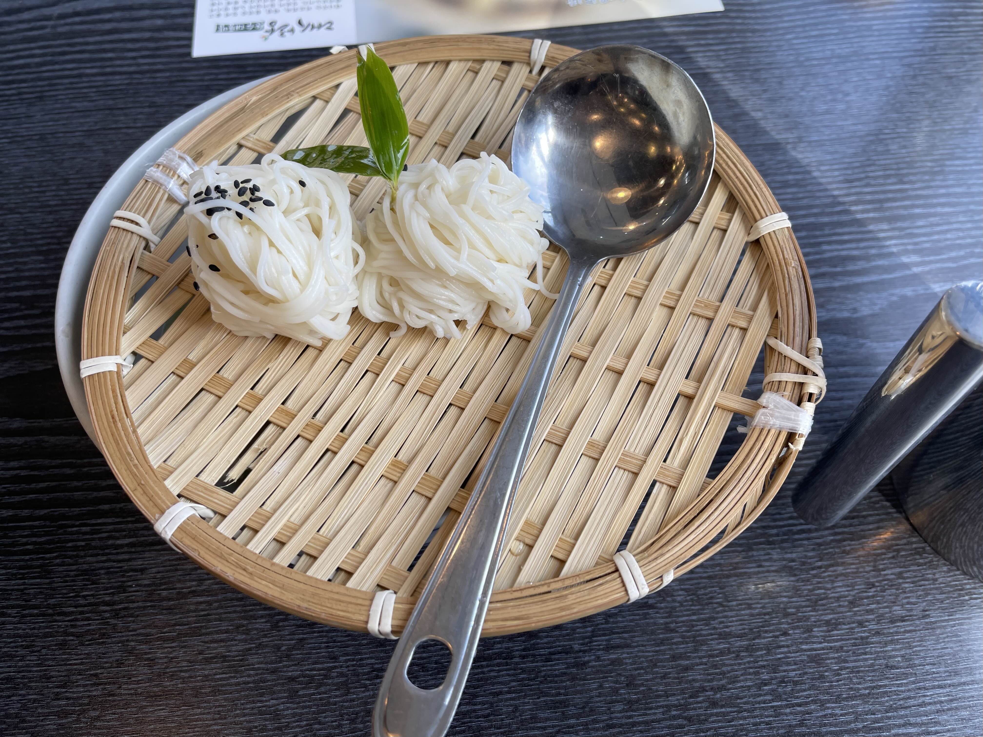 칼같이 소면사리가 나와주고요, 저 대나무 바구니를 들어올리면 아래 국수 육수가 있어요.