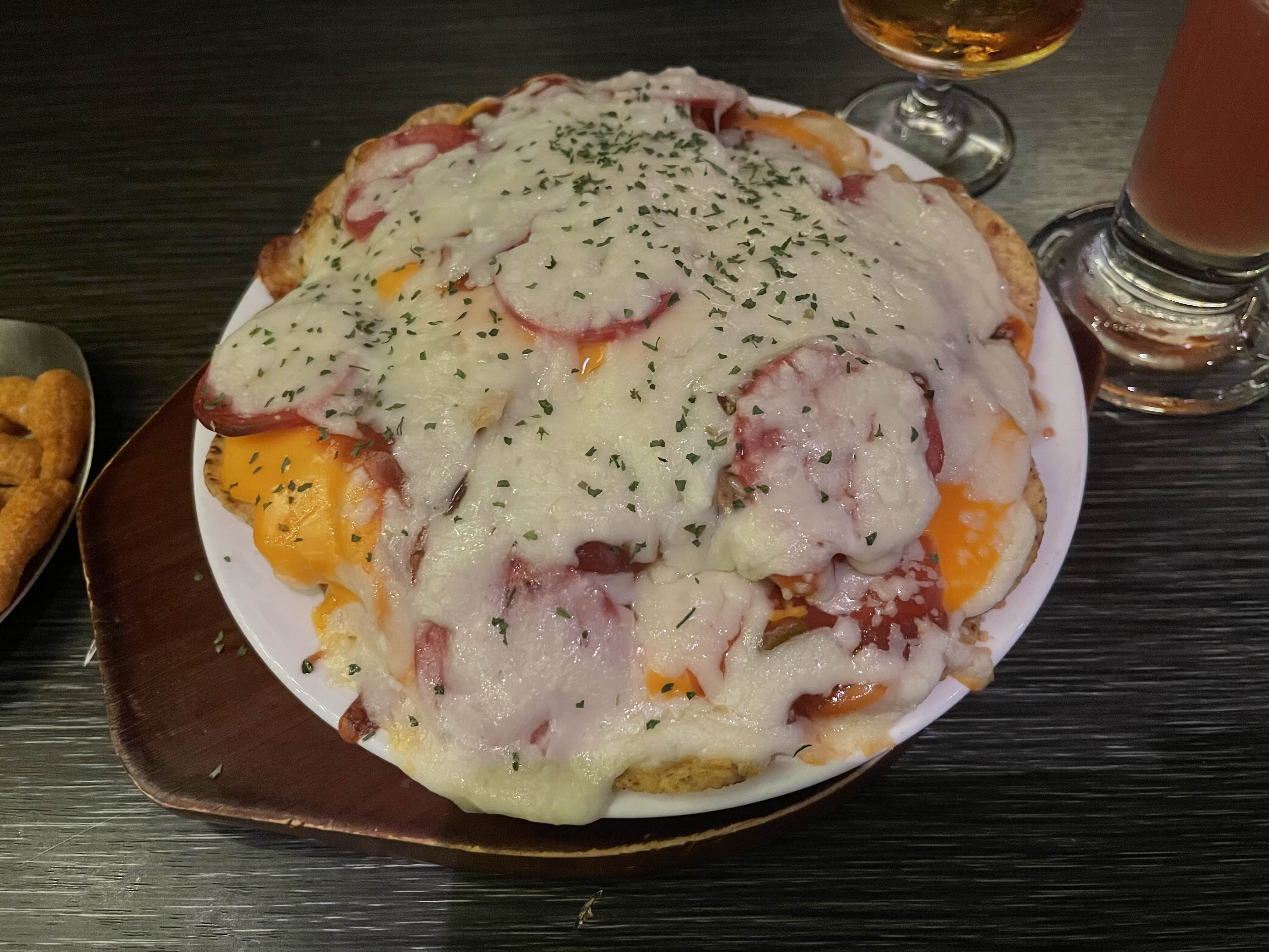 나쵸 위에 피자소스와 페퍼로니 그리고 치즈가 듬뿍 올라가 있어요.