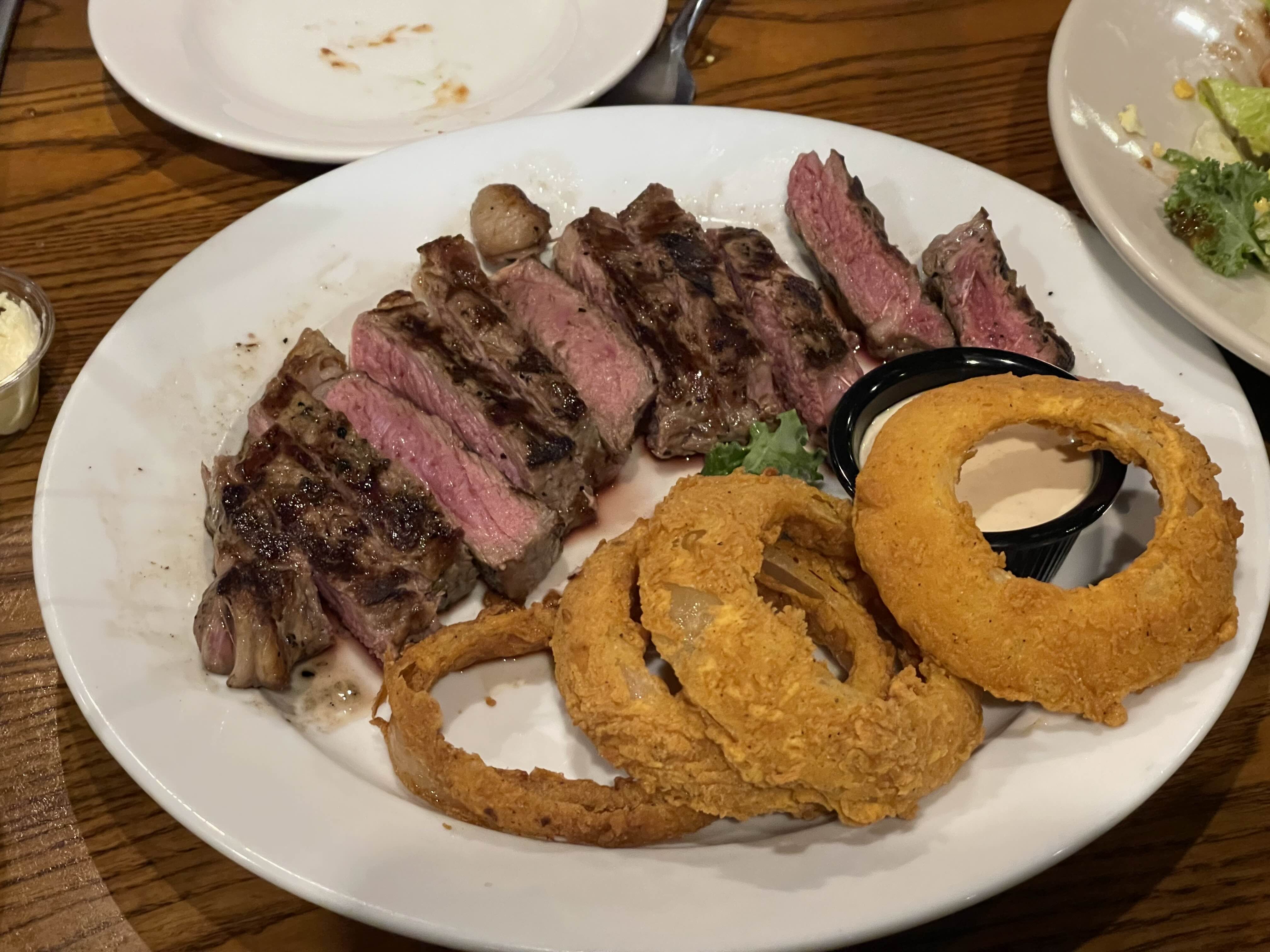 2인이서 뉴욕스트립,어니언링,BBQ치킨샐러드,스프라이트 먹고