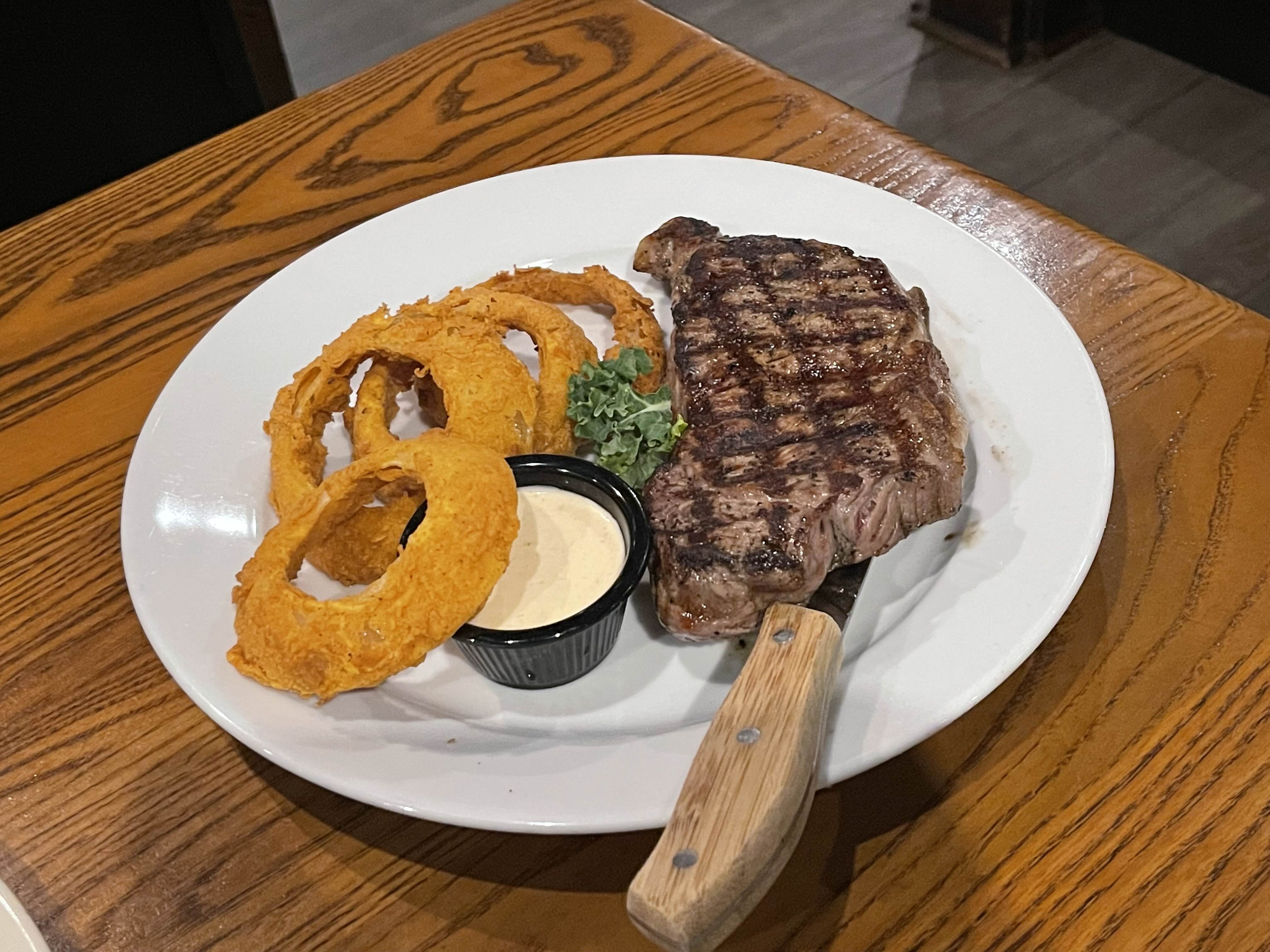 주문한 뉴욕스트립과 사이드 어니언링이 멋드러진 한접시로 나를 찾아와요.