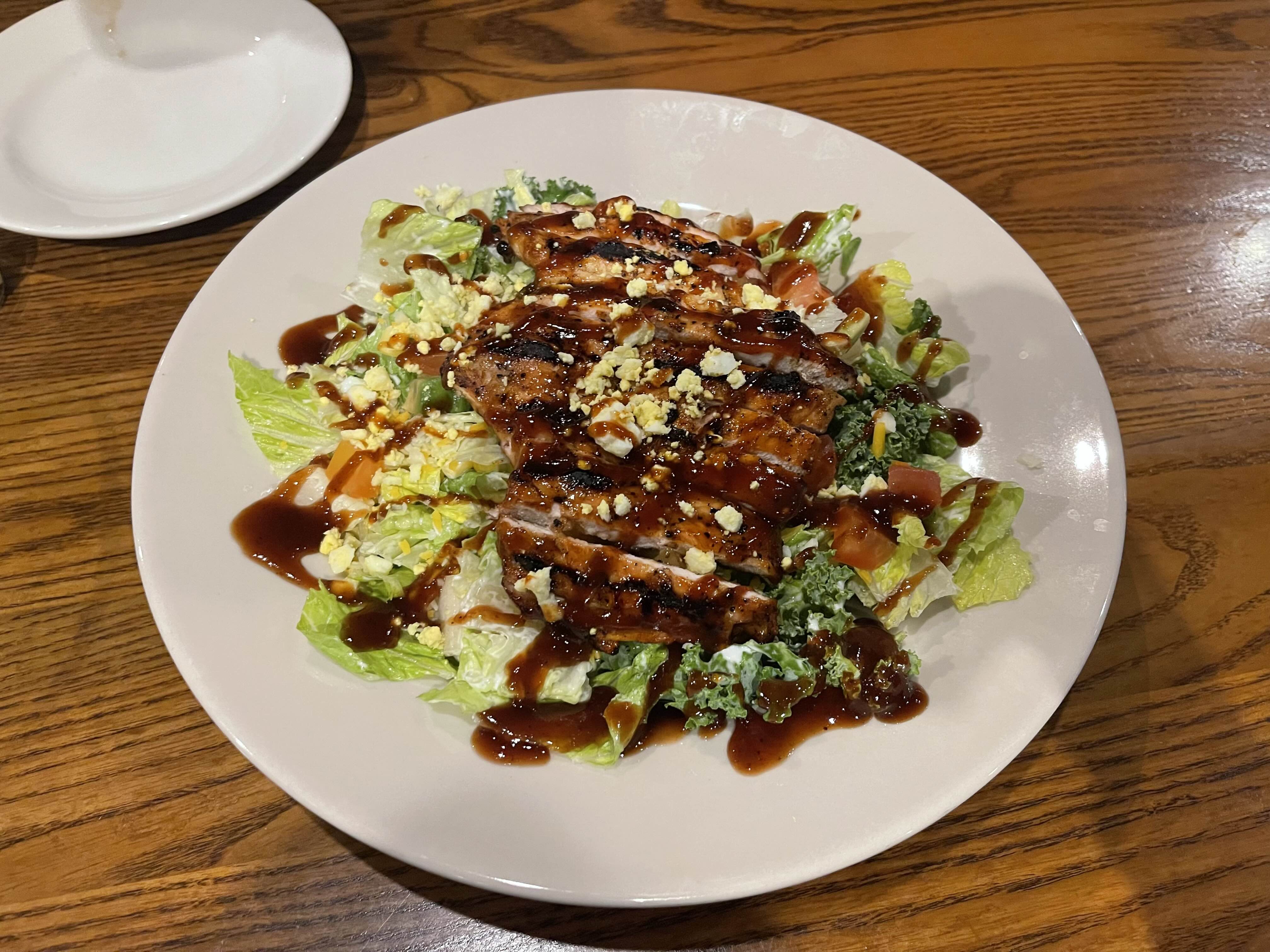 양상추 등 야채 위에 으깬 계란과 구운 치킨위에 bbq소스가 뿌려진 샐러드예요.