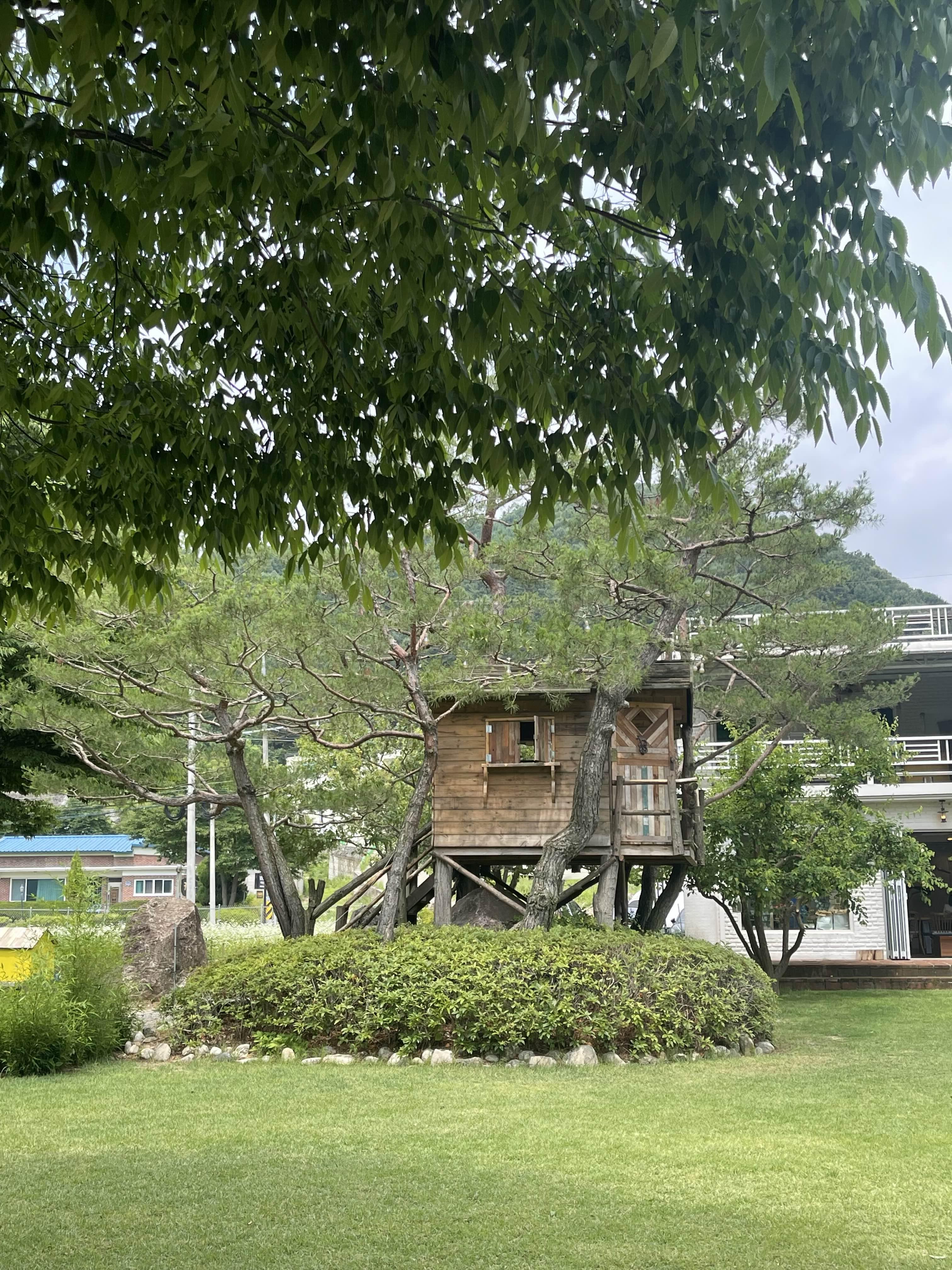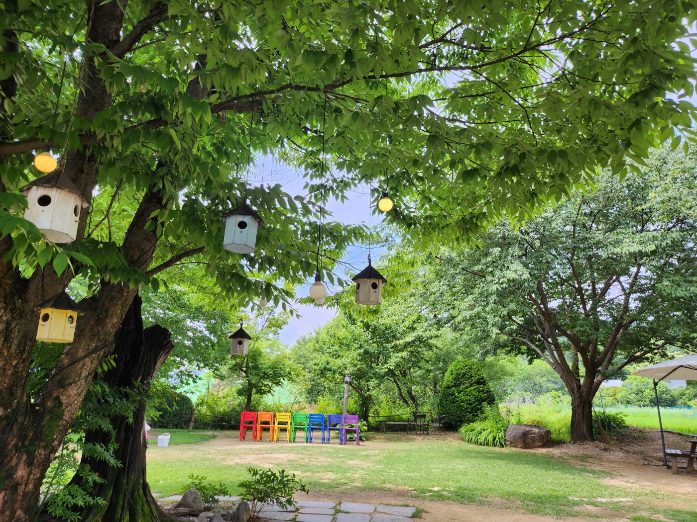 코미호미 잔디밭의 중앙에 위치한 거대 나무 아래 앉으면 보이는 알록달록 의자 포토존까지.