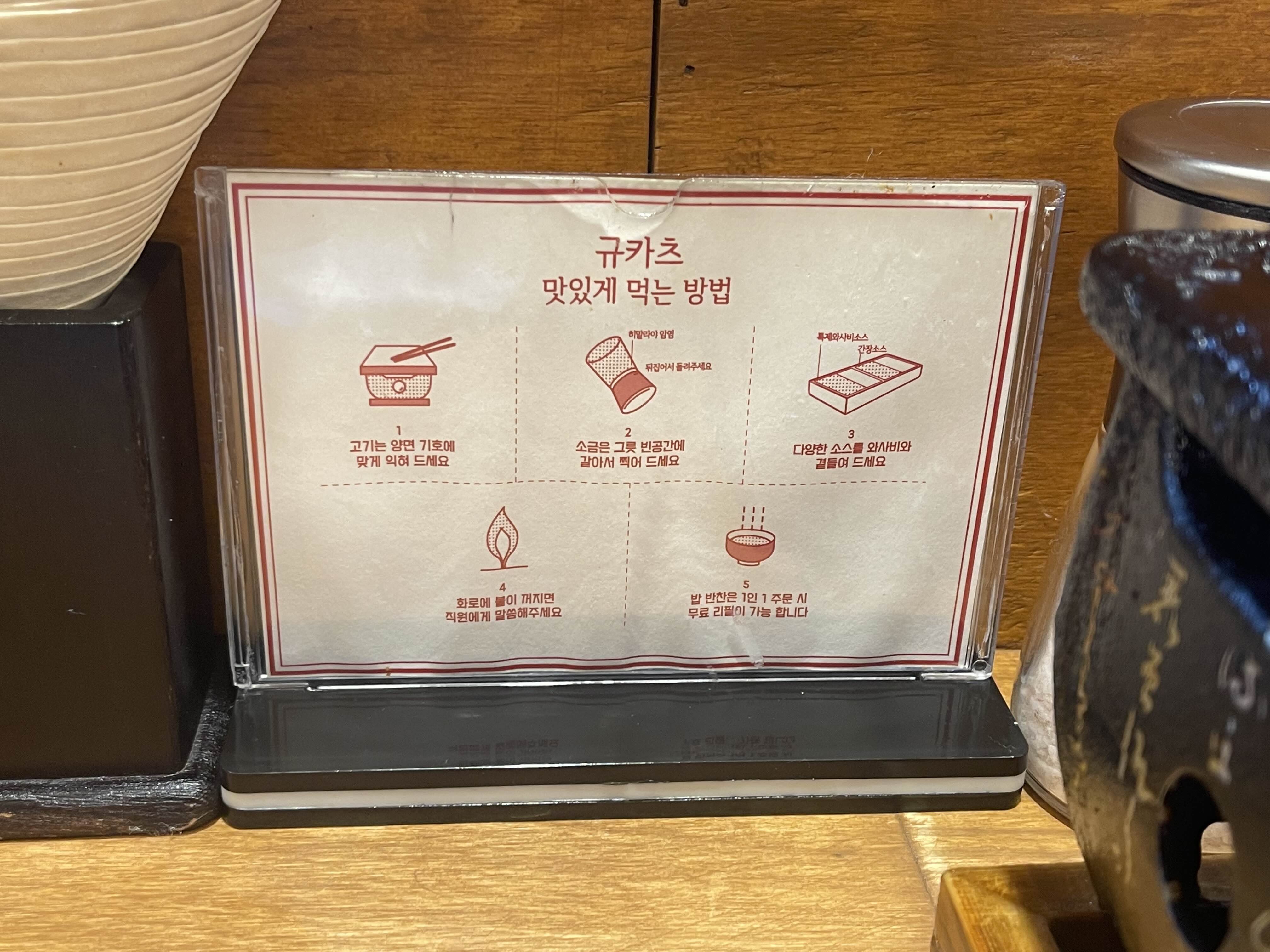 테이블에 비치된 규카츠 맛있게 먹는 법을 정독하면서 기다려보아요.