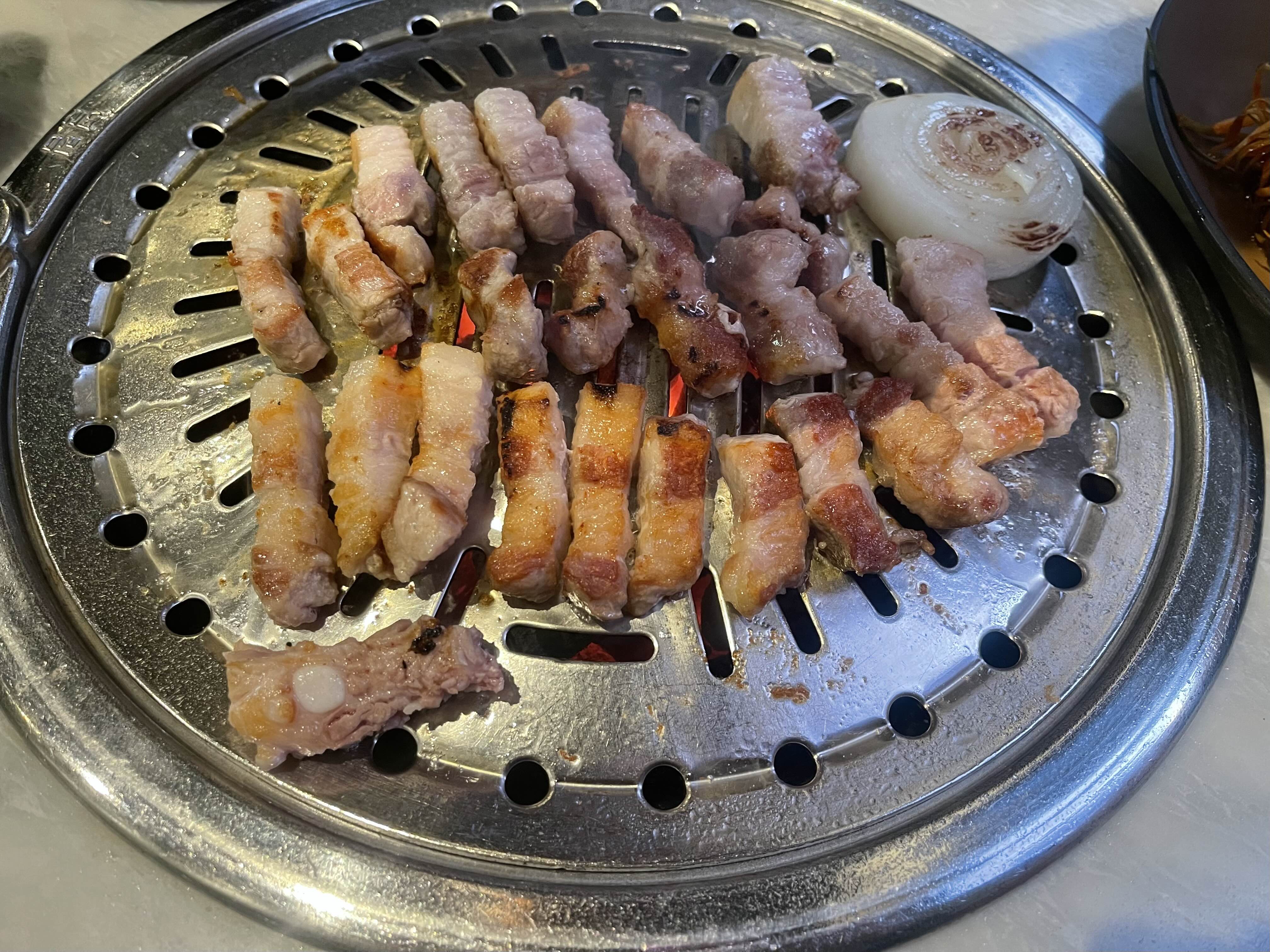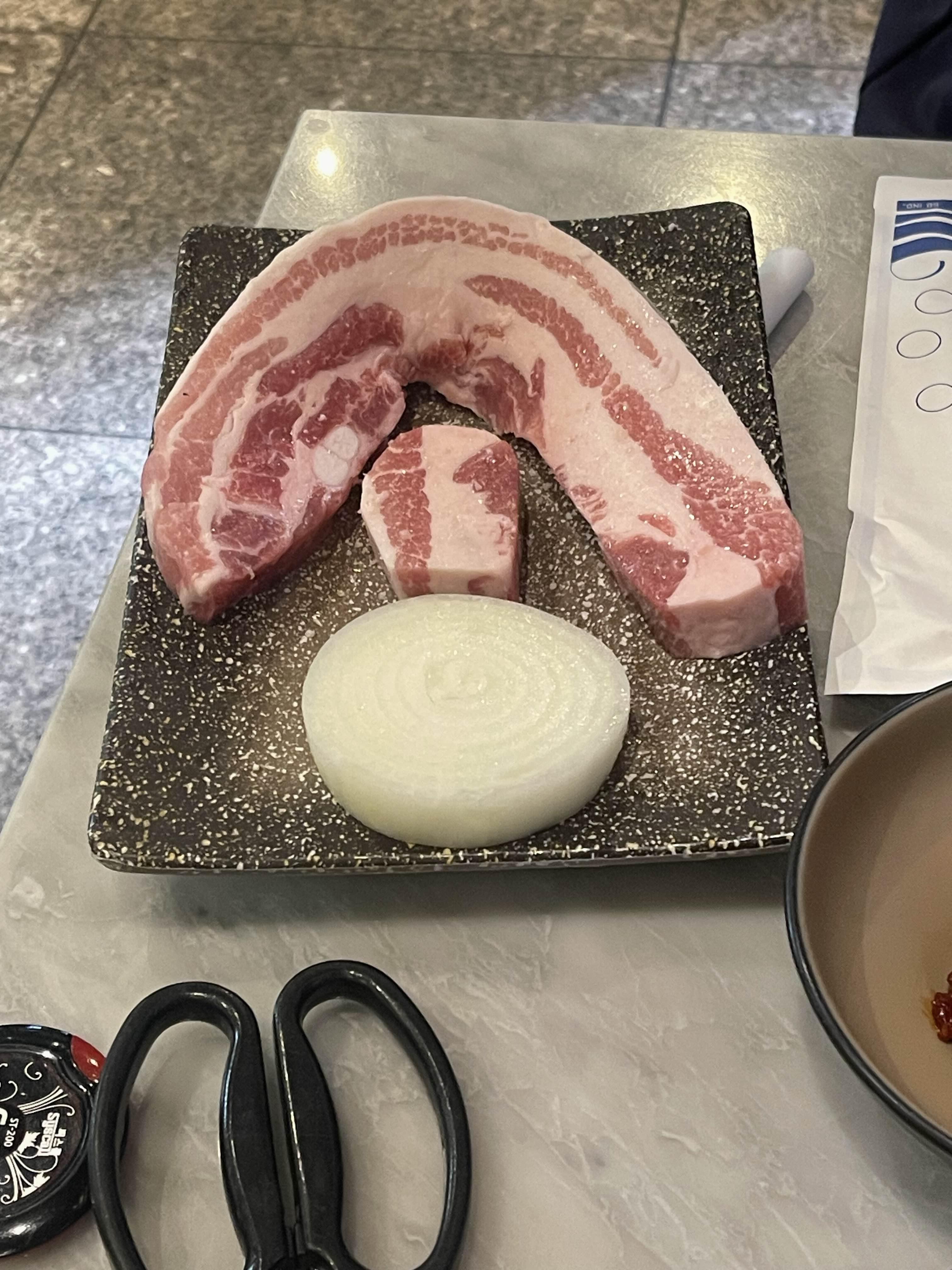 삼겹살이 요로코롬~ 양파 한덩이와 같이 나와주어요.