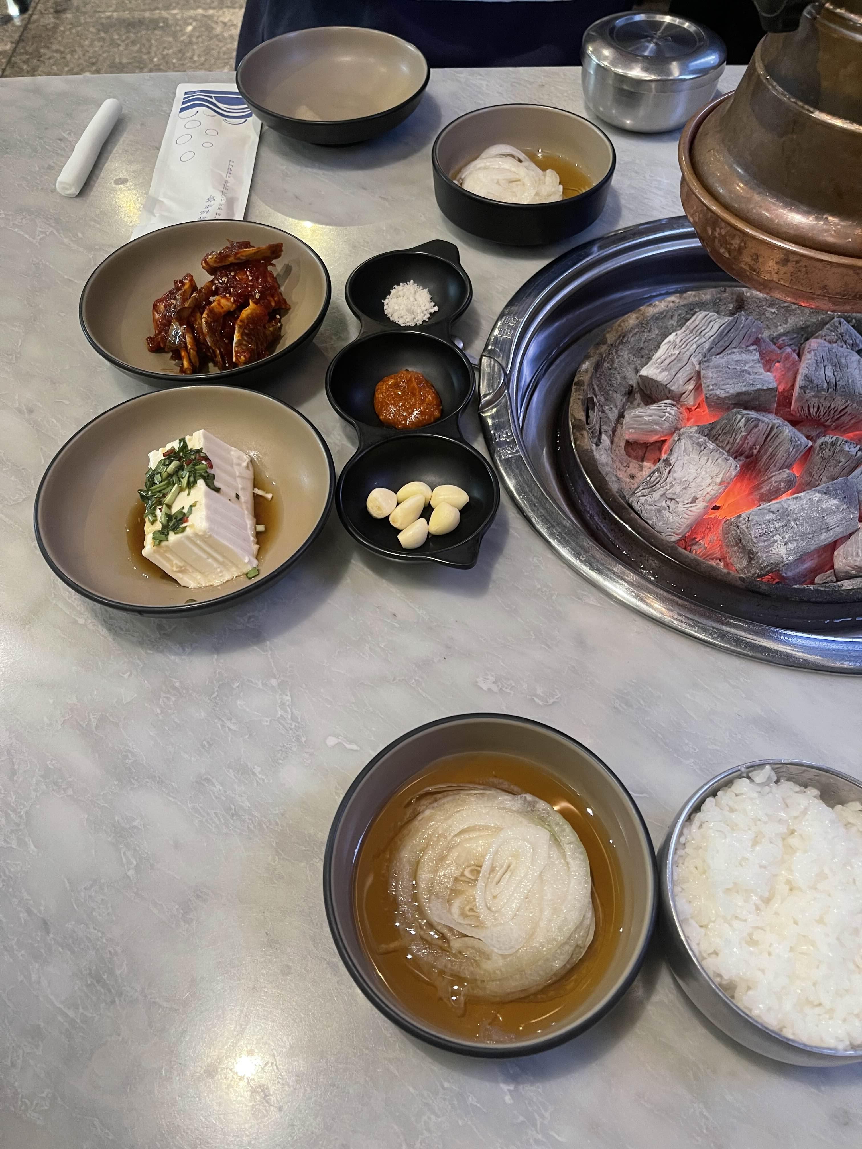 밥 위에 고기 올리고 쌈장, 양파 올려서 크왕크왕.