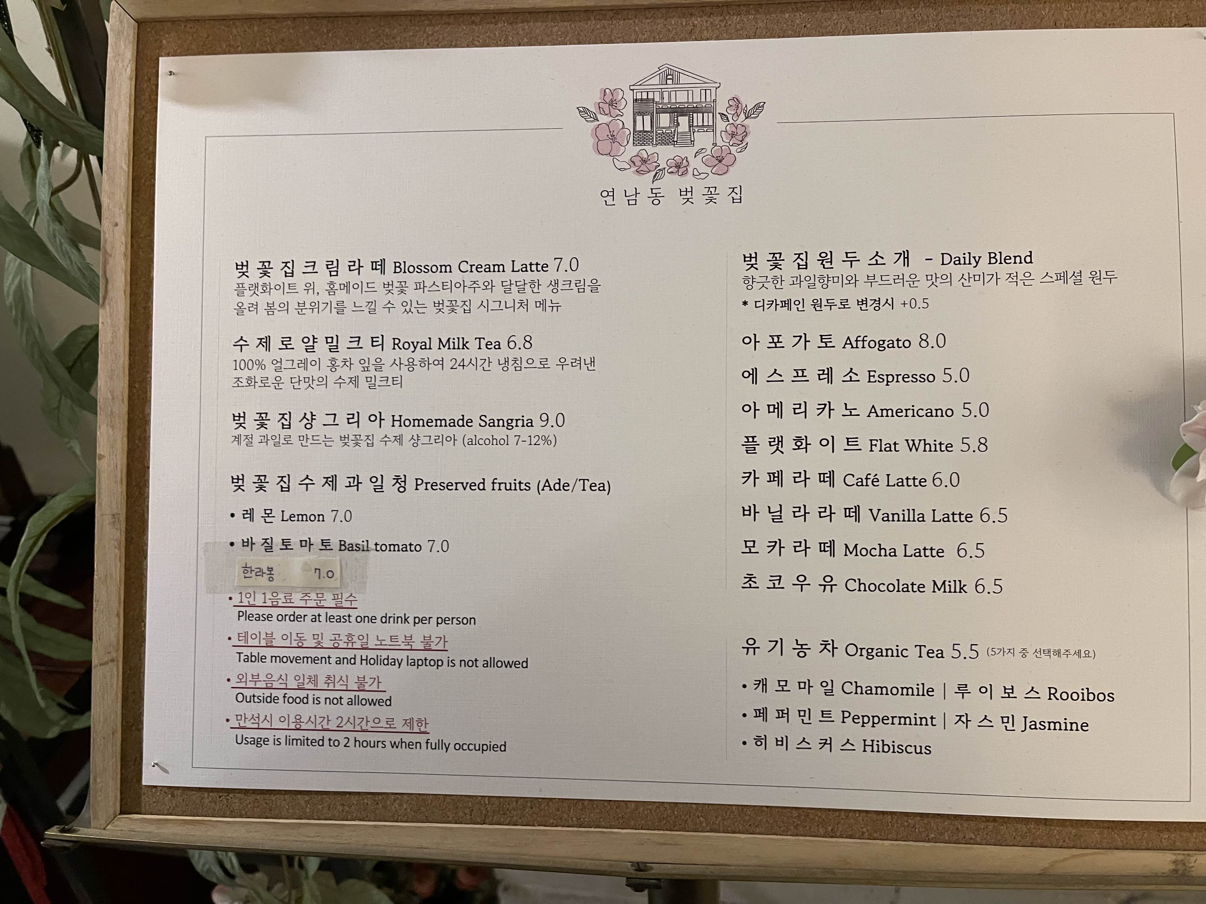 이름이 연남동 벚꽃집인 만큼 벚꽃시즌엔 마당에 멋드러지게 벚꽃이 핀다고하네요.