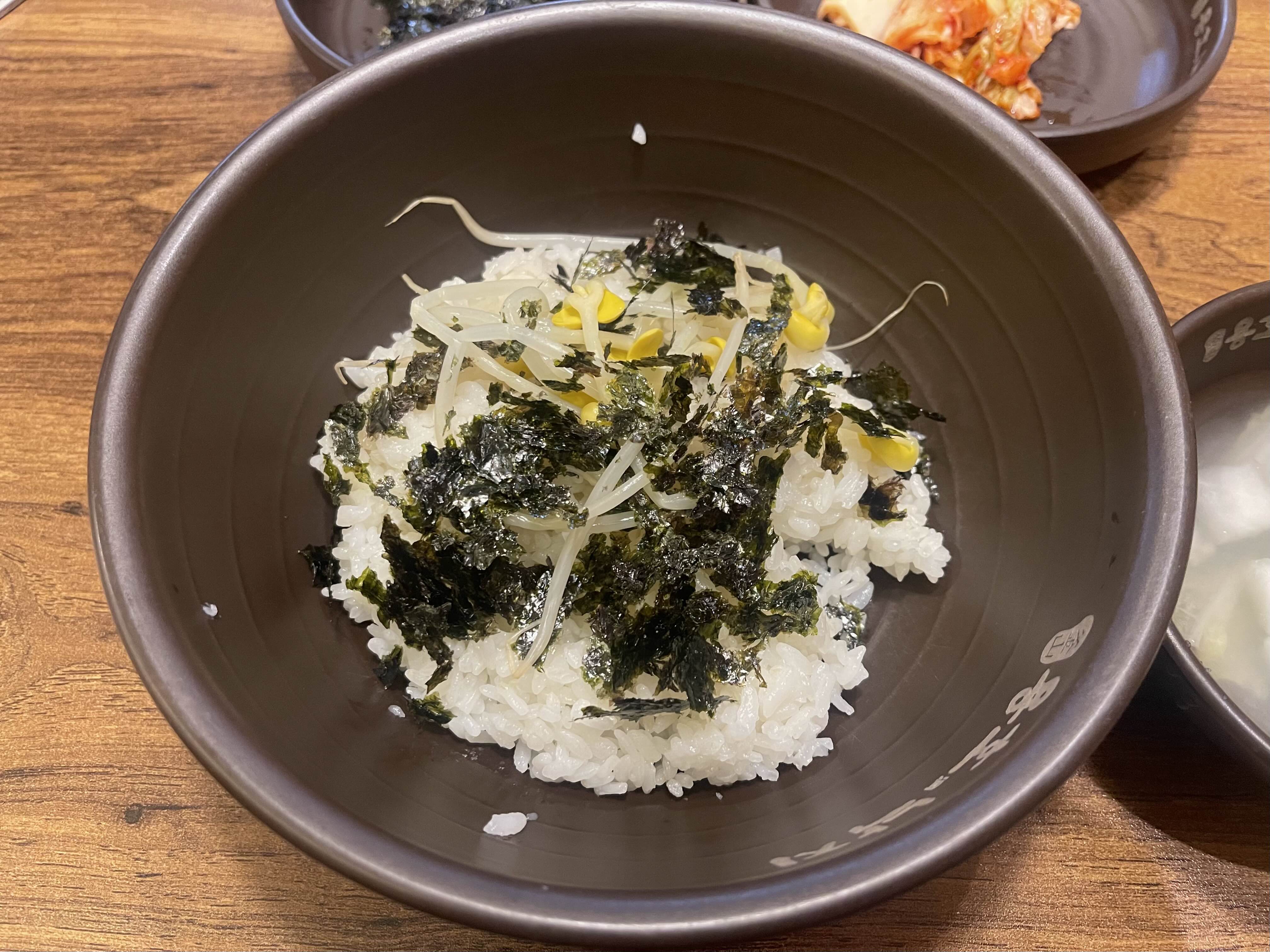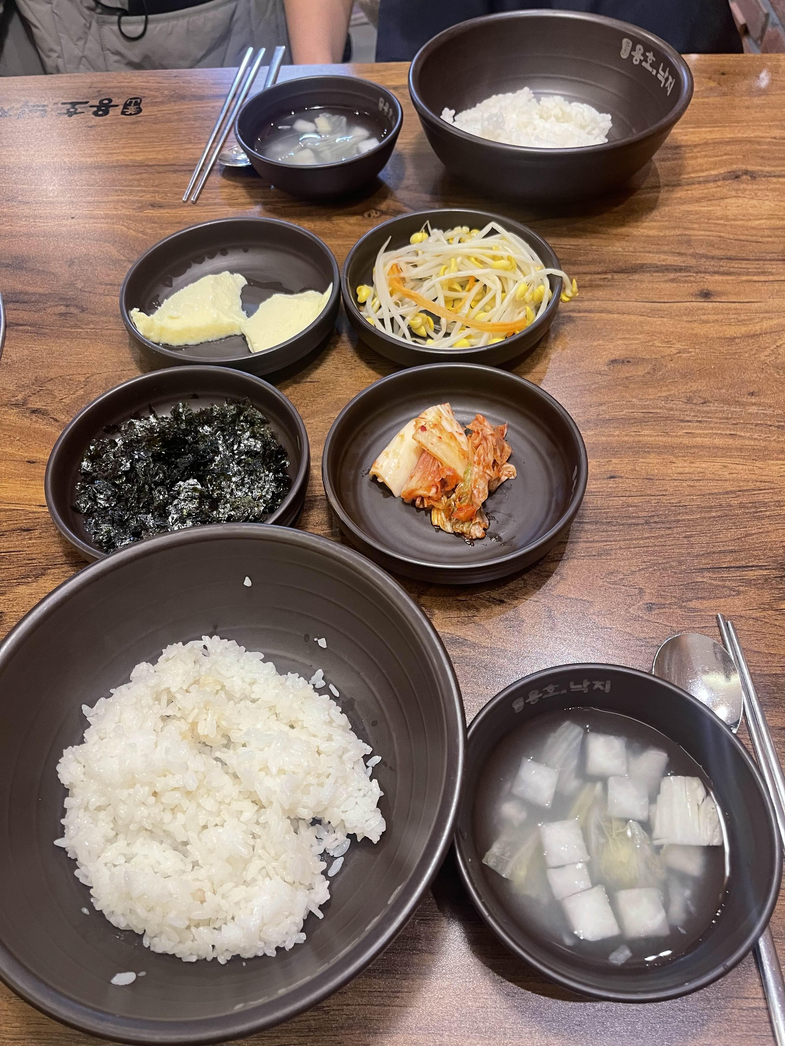 밥, 동치미, 김가루, 김치, 콩나물, 계란찜이 나와주어요.