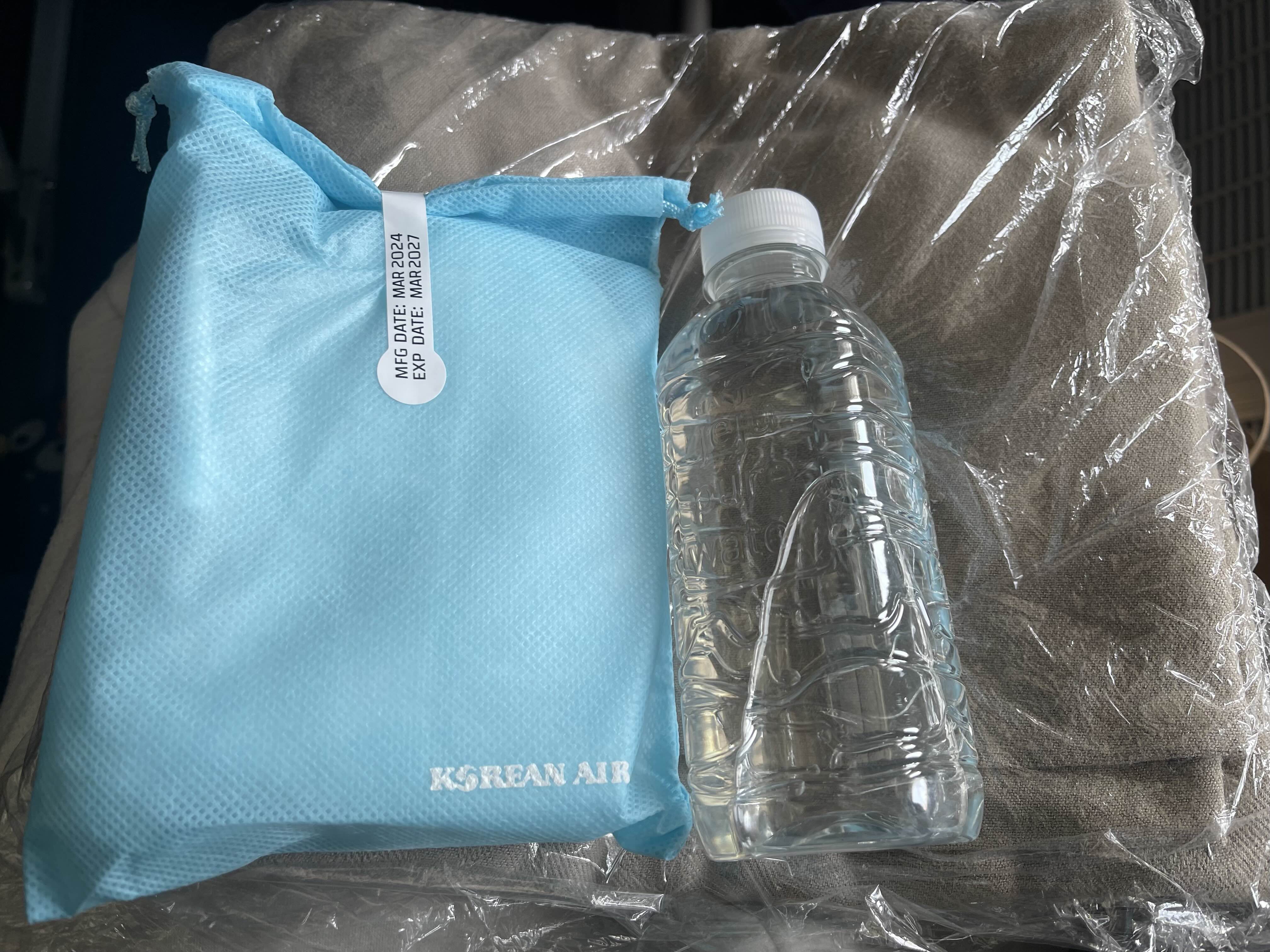 장거리 비행이라그런지 담요, 물, 슬리퍼, 칫솔치약 세트가 준비되어있었어요.