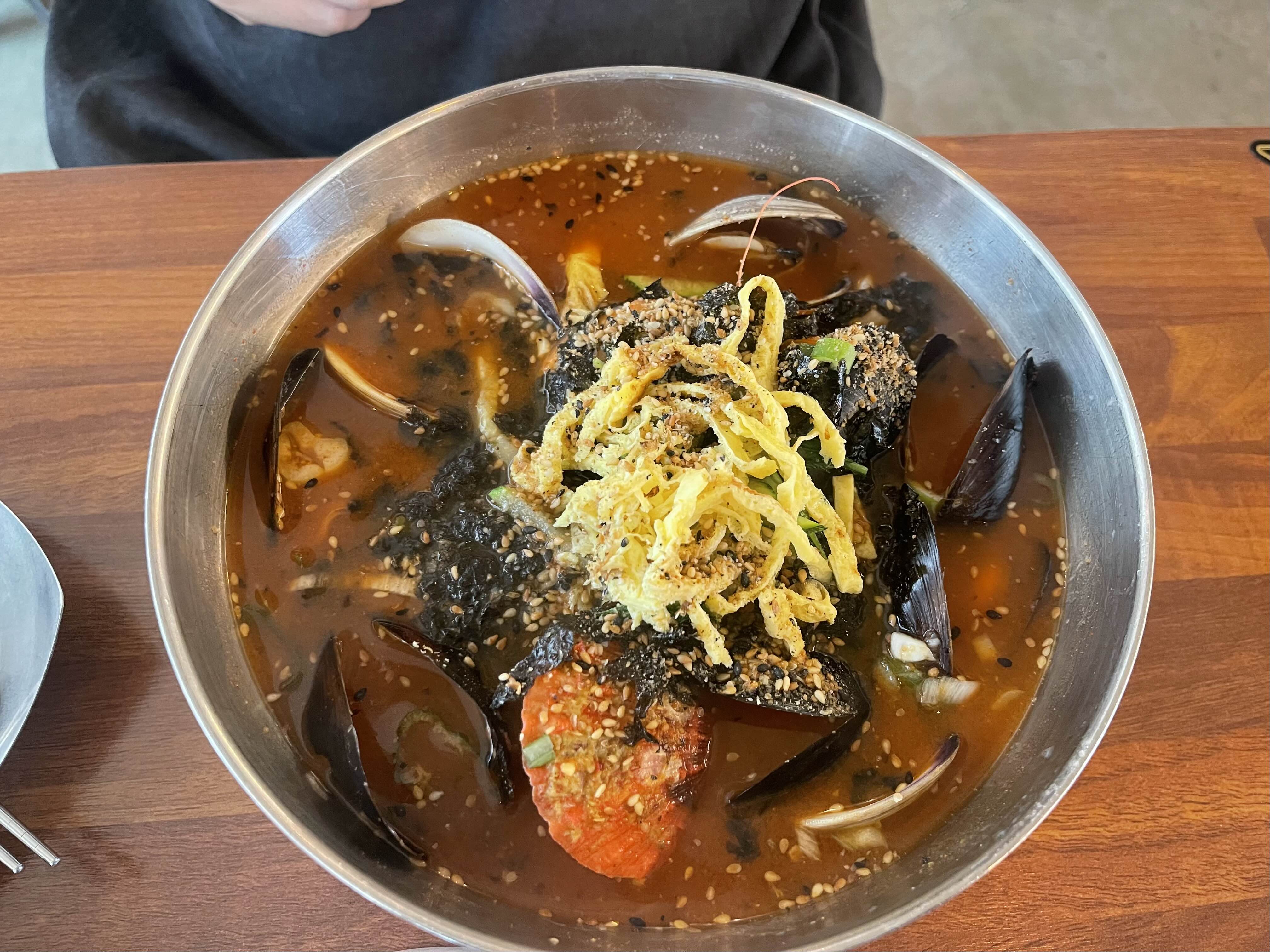 해물장칼국수예요.