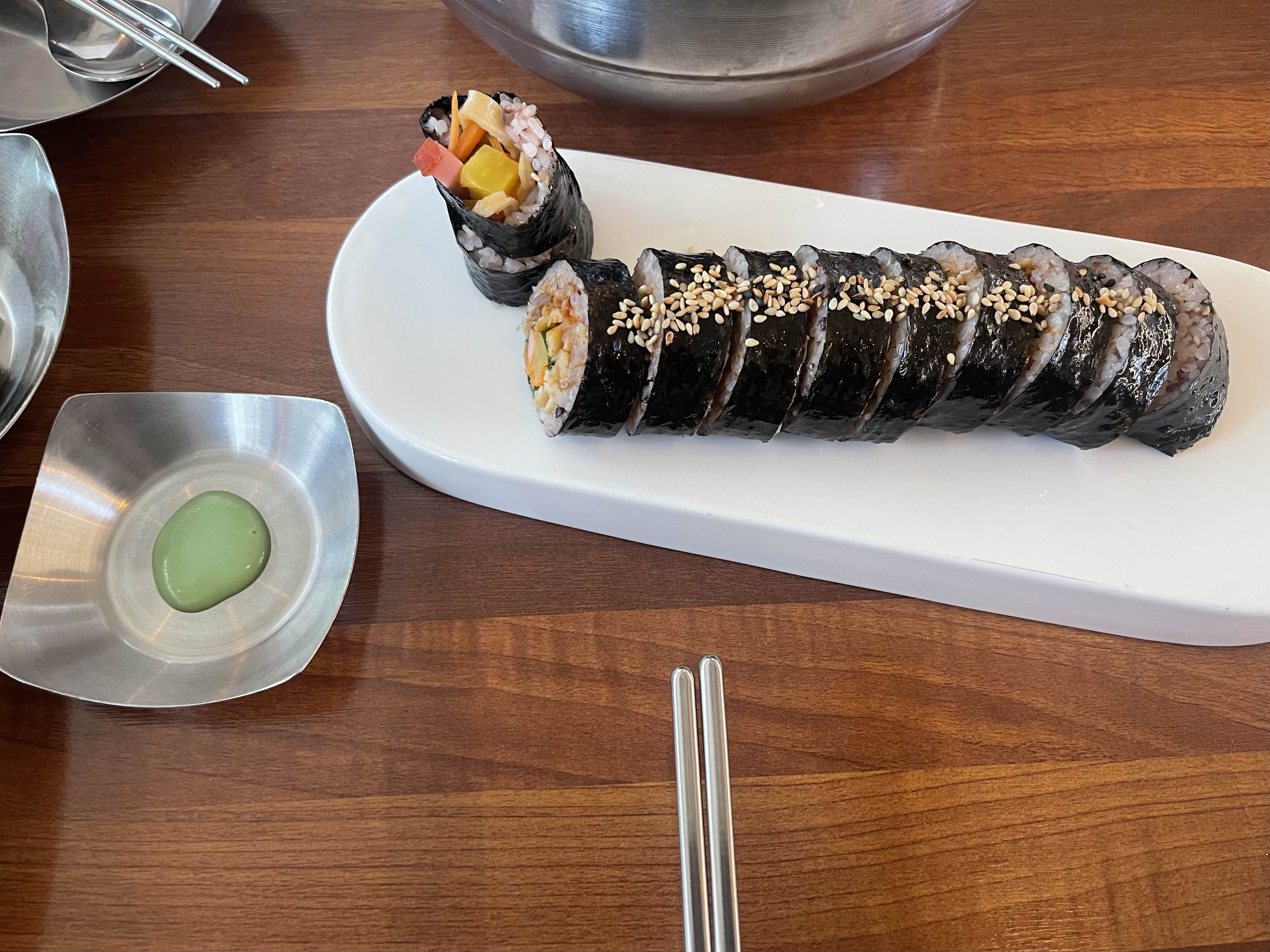 백김치와 무생채, 김밥에 찍어먹을 고추냉이소스도 나와주었답니다.