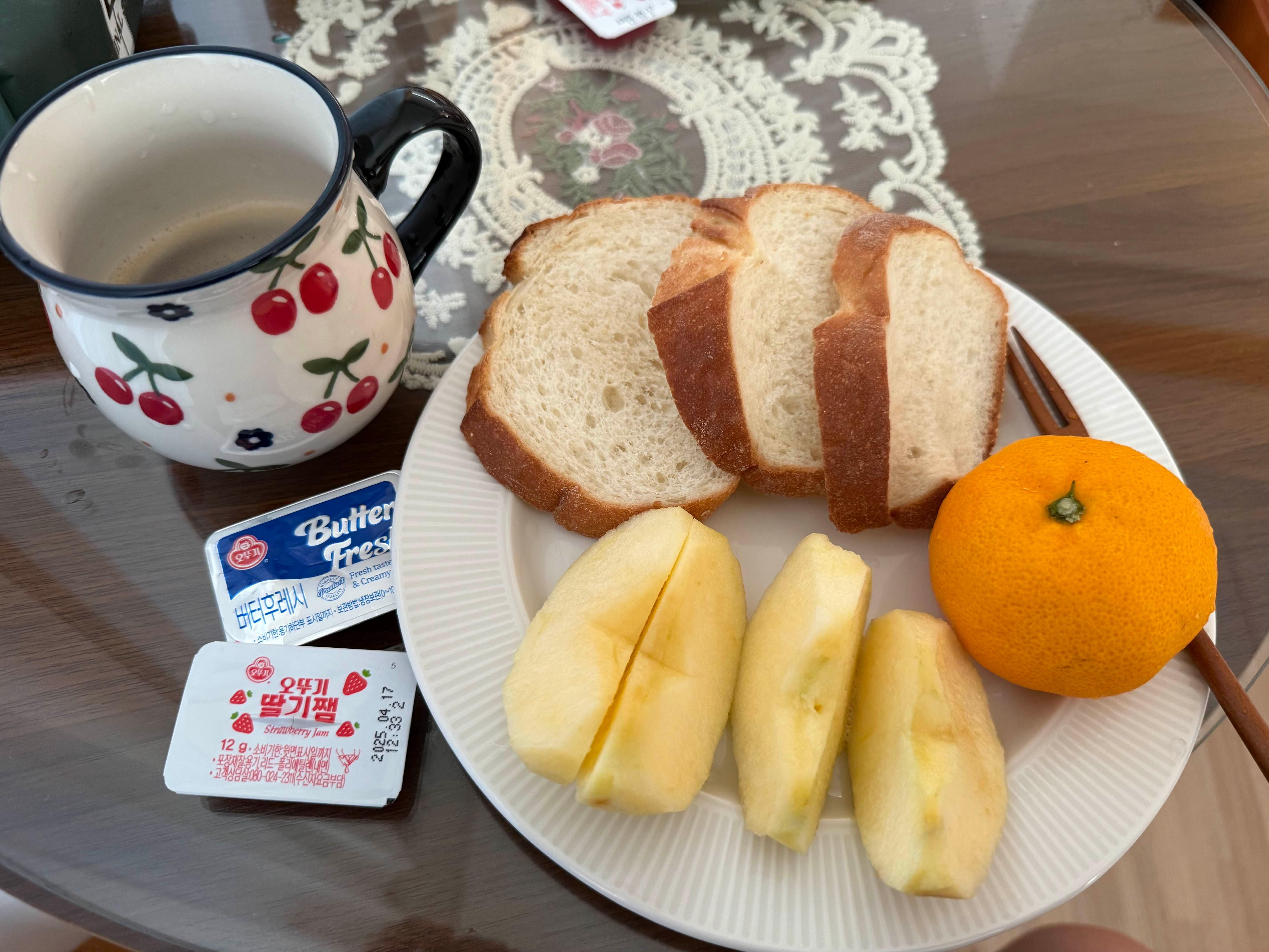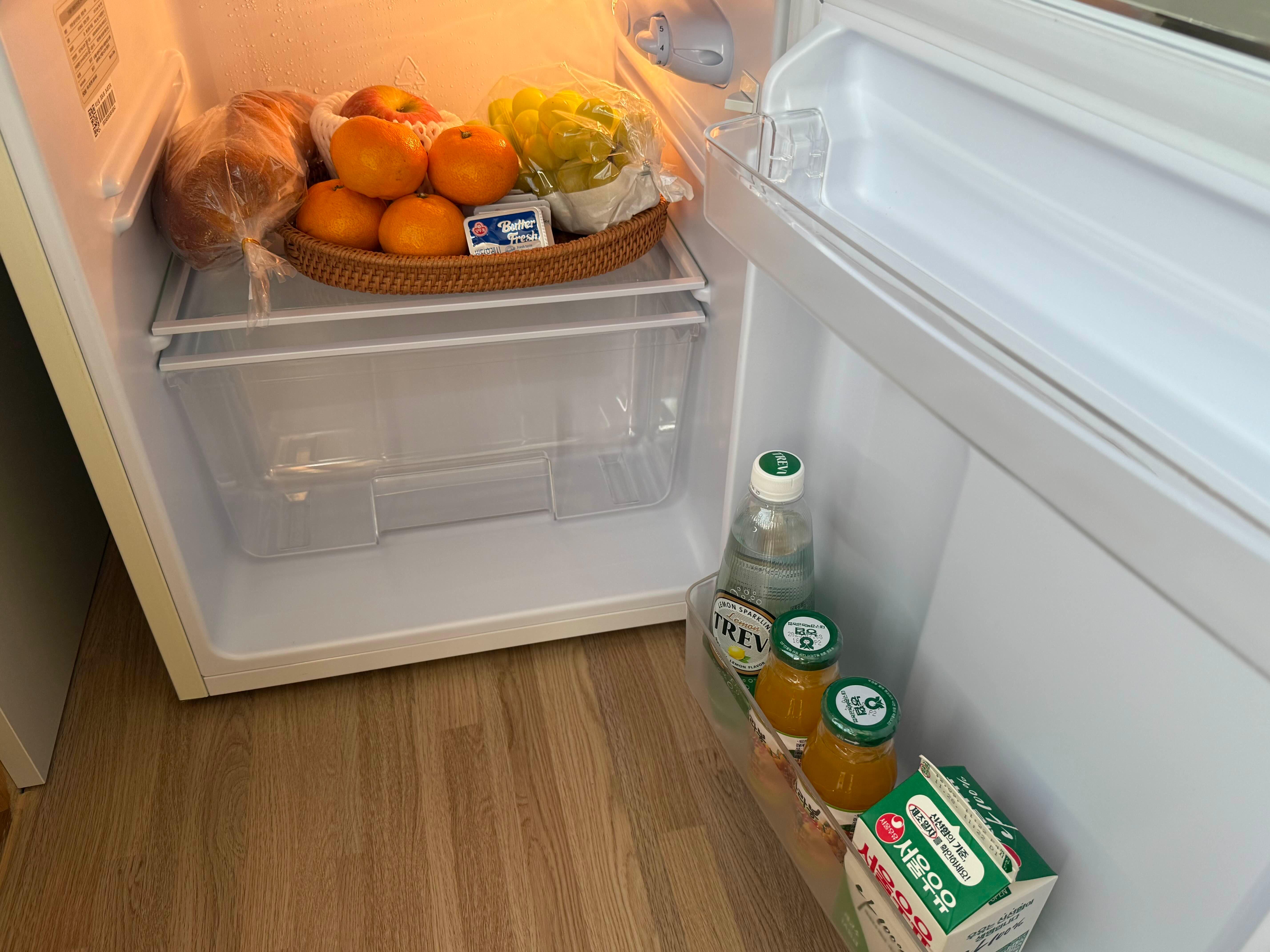 냉장고에는 우리들의 아침을 책임져줄, 거대빵과(?) 과일들이 들어있어요.