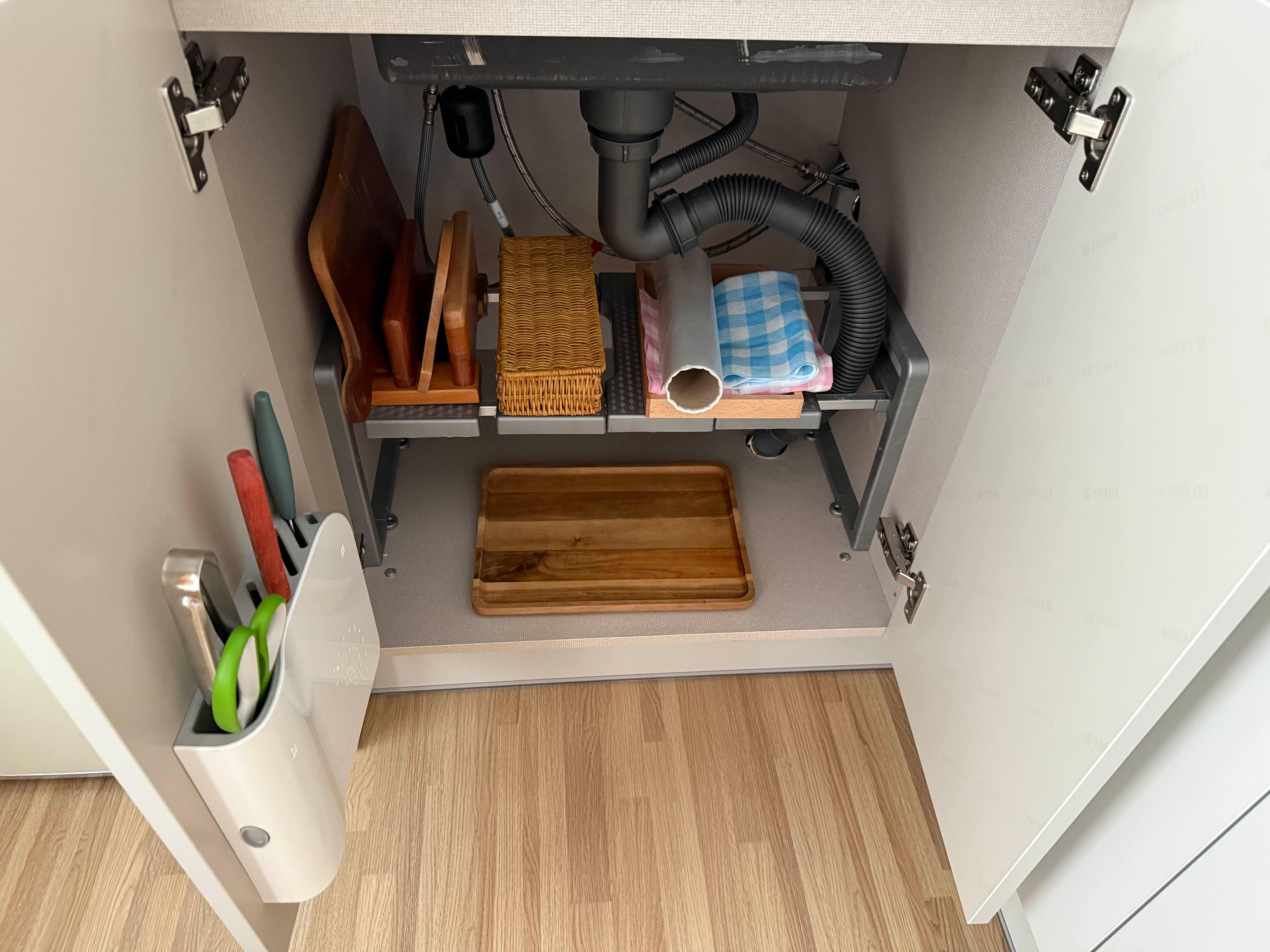 싱크대 아래 서랍에는 칼, 도마, 식기류 쟁반까지 준비되어있고,