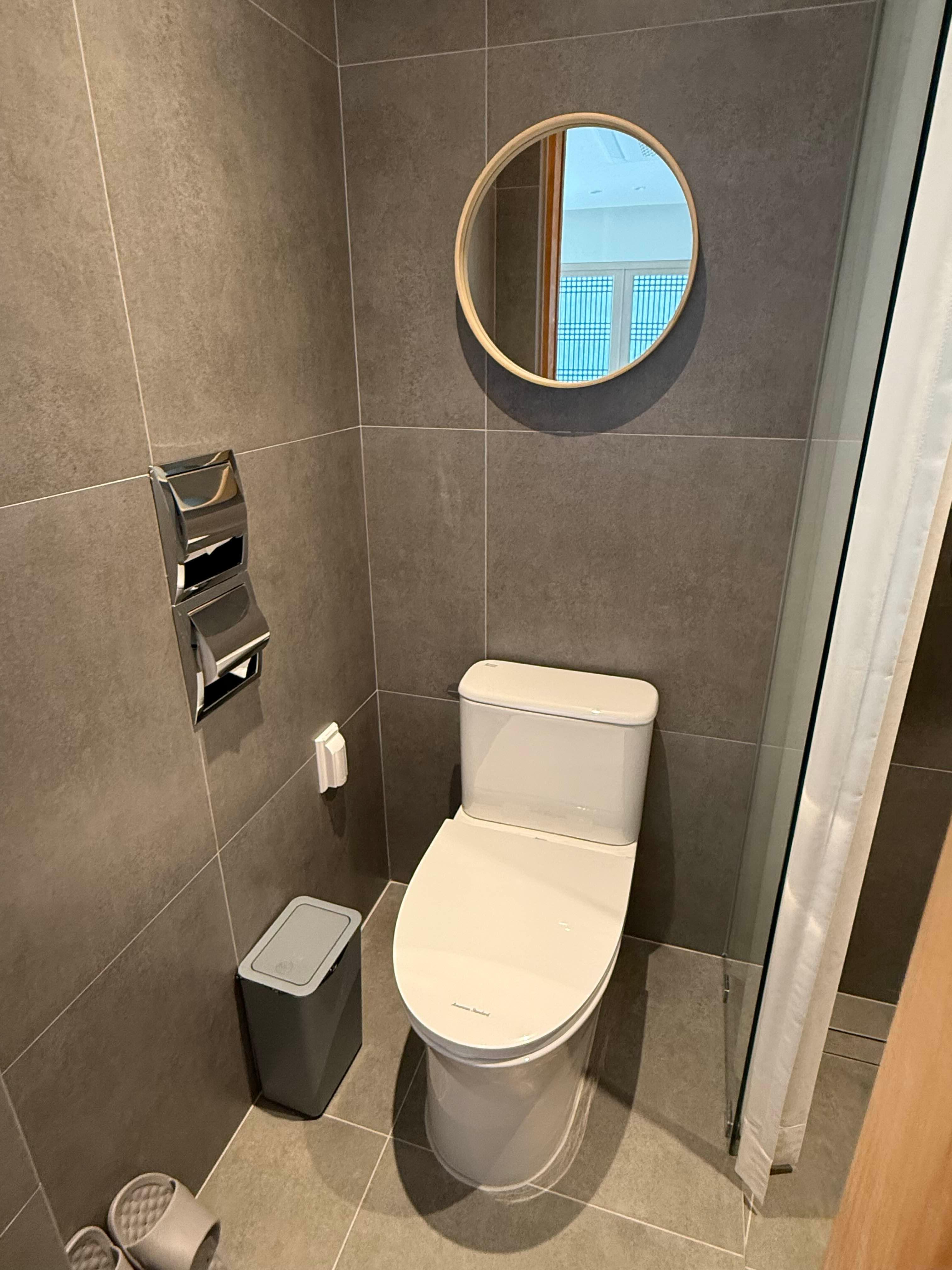화장실 입구에는 요로코롬 변기와 거울이 있어요.