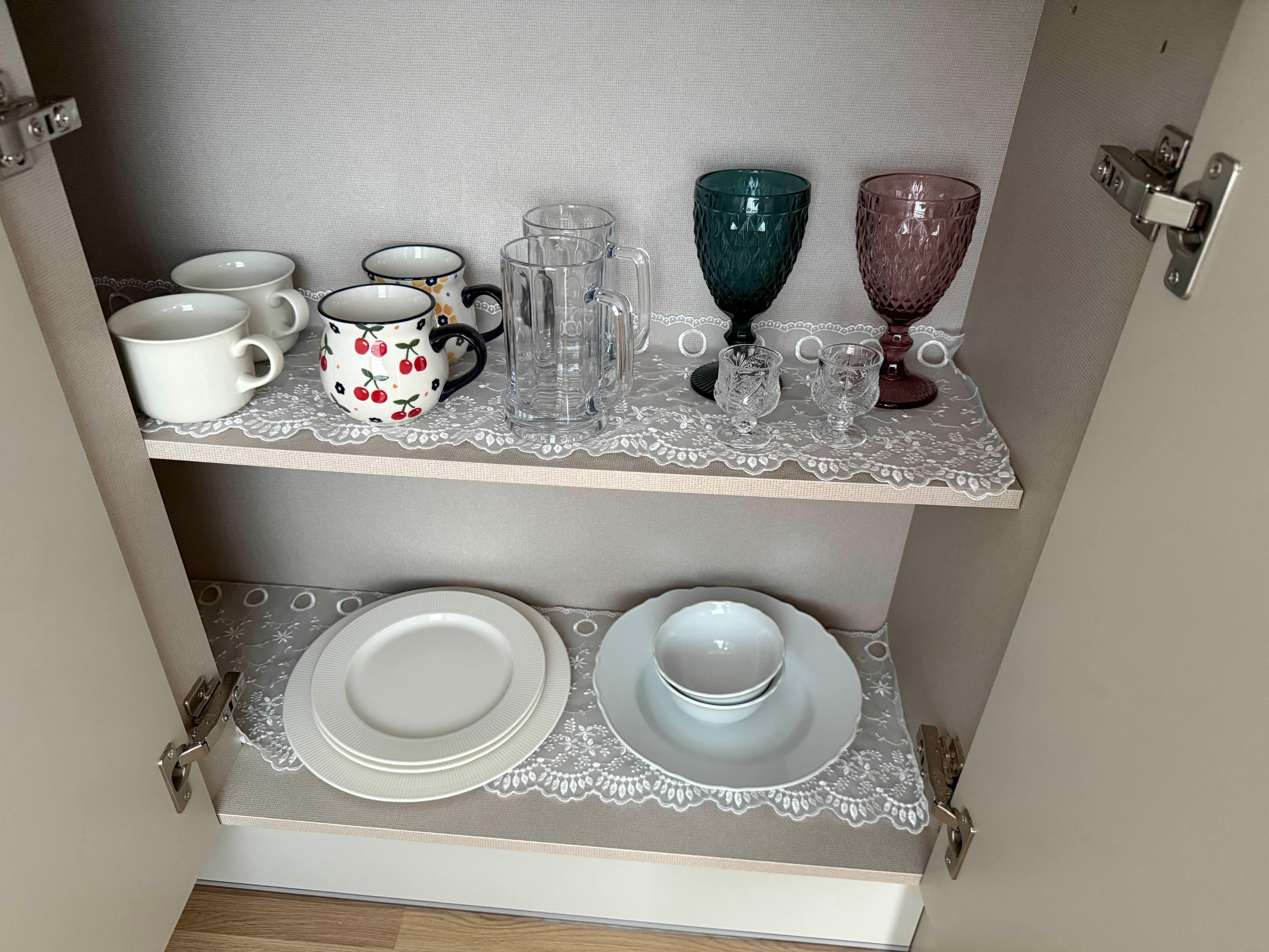 전자레인지 아래 서랍에는 요로코롬 다양한 잔들과 접시들도 있어요.