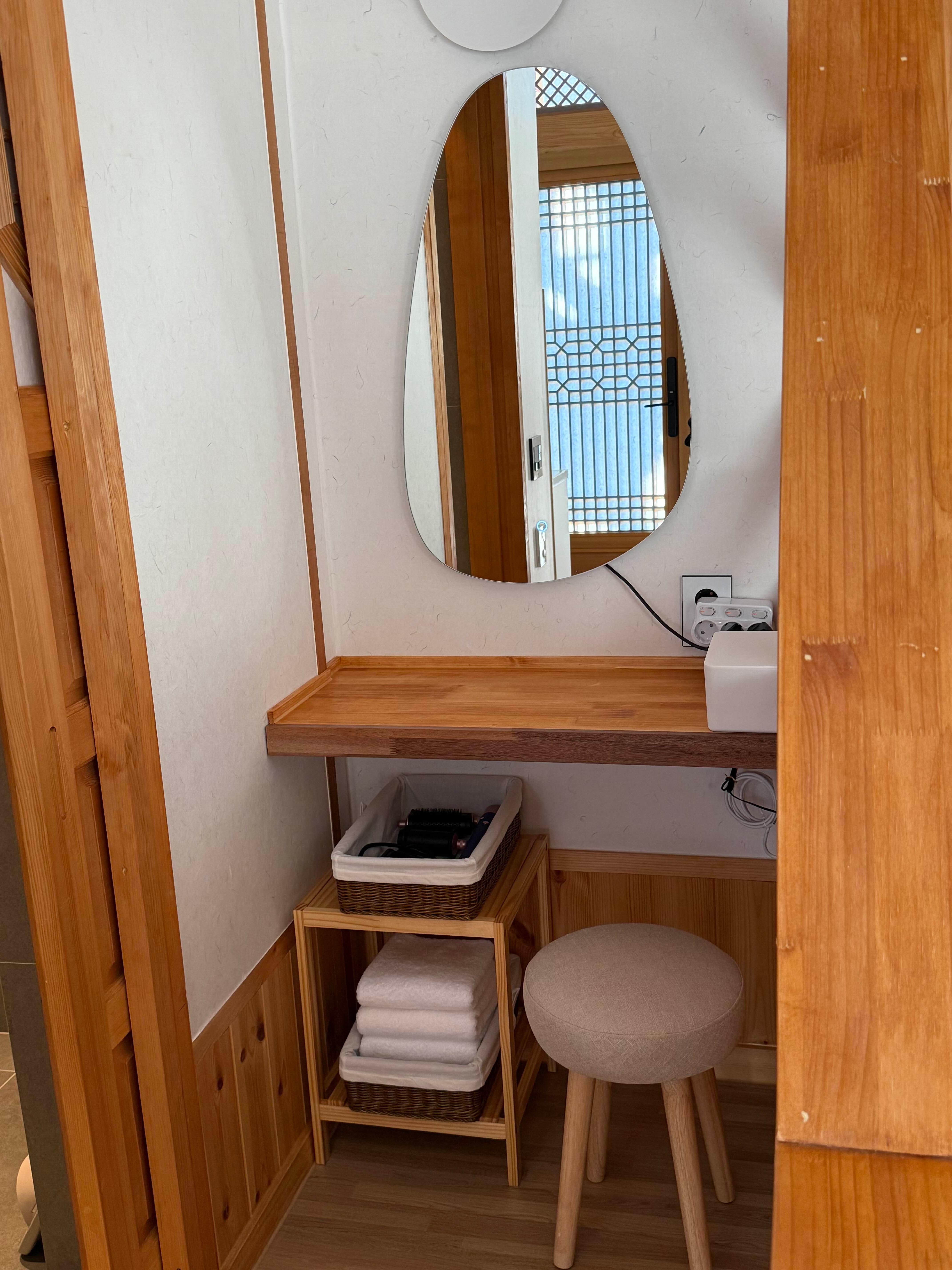 화장대 아래 수건이 깔끔하게 정리되어있고,