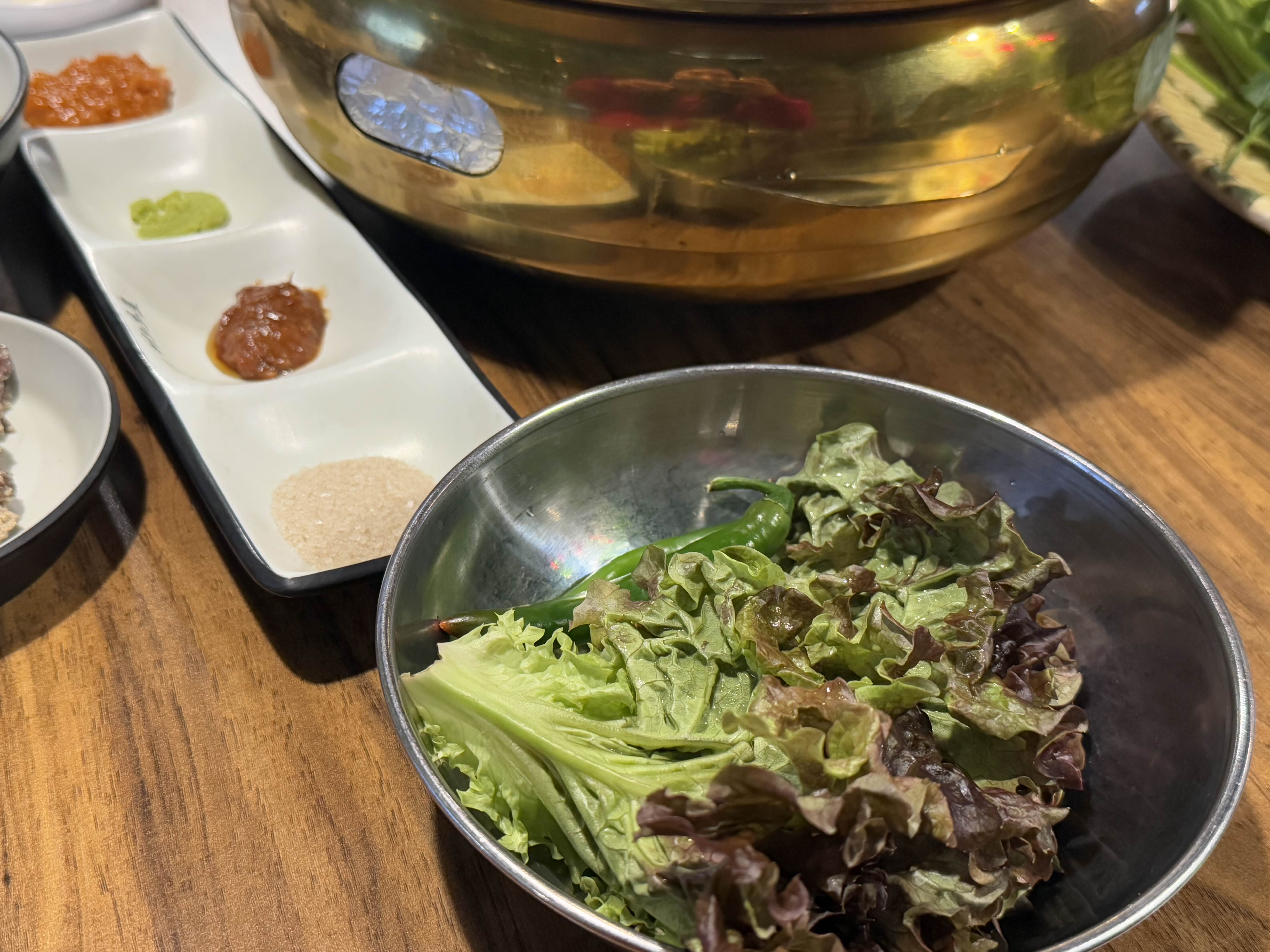 쌈장, 고추냉이, 갈치속젓(?),소금 4종 세트와 쌈야채