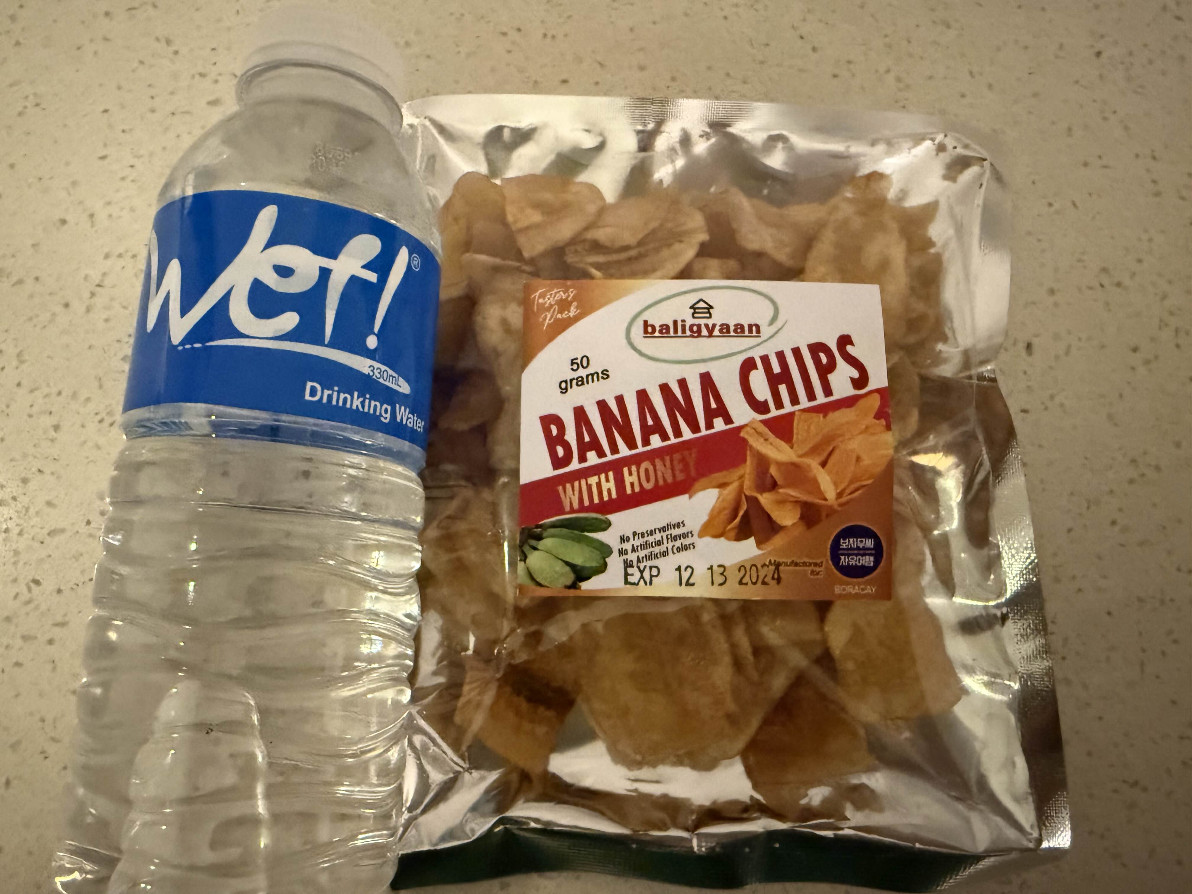 도착하자마자 정신없는 와중에 인당 물과, 바나나칩을 손에 들려주어요.