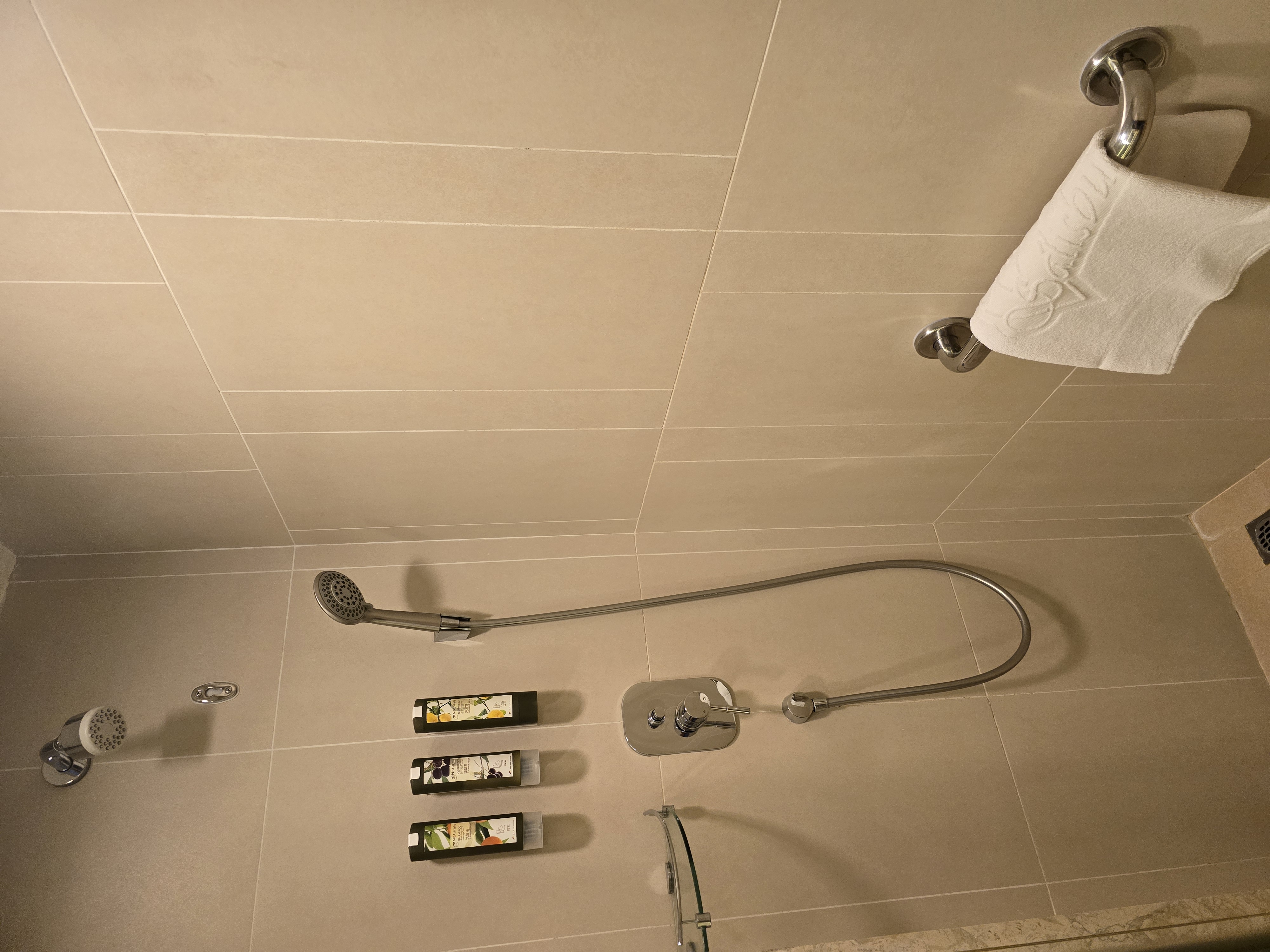 샴푸, 바디 아시, 트리트먼트는 사진에 보이는 샤워기 옆 튜브에 있어요.