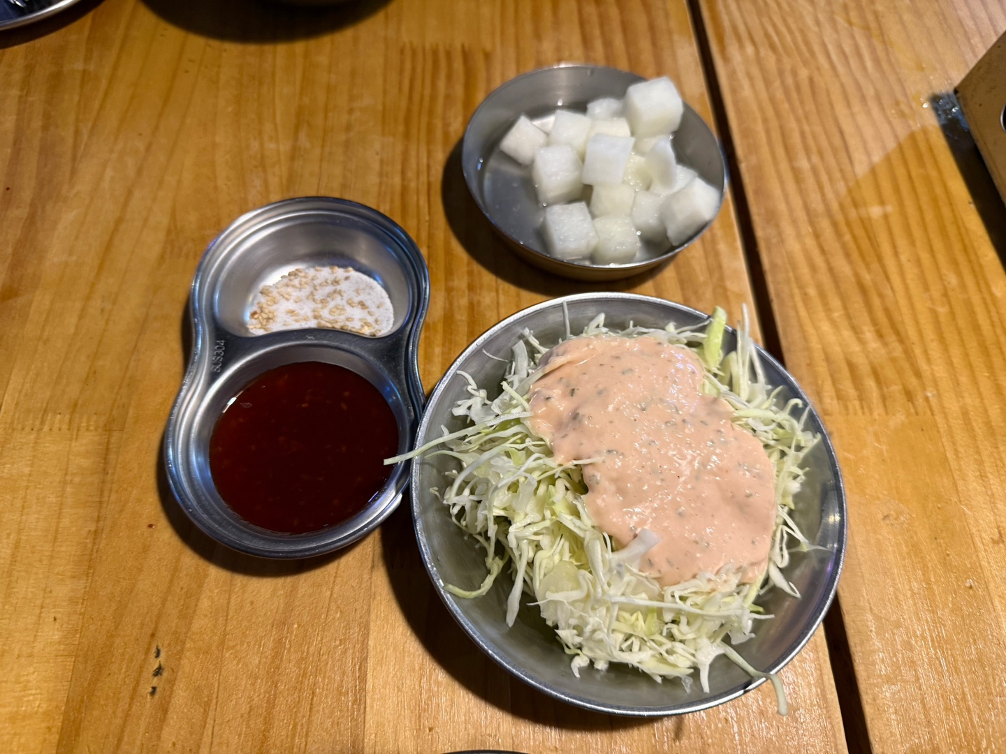 양념치킨소스, 소금, 치킨무, 양배추샐러드