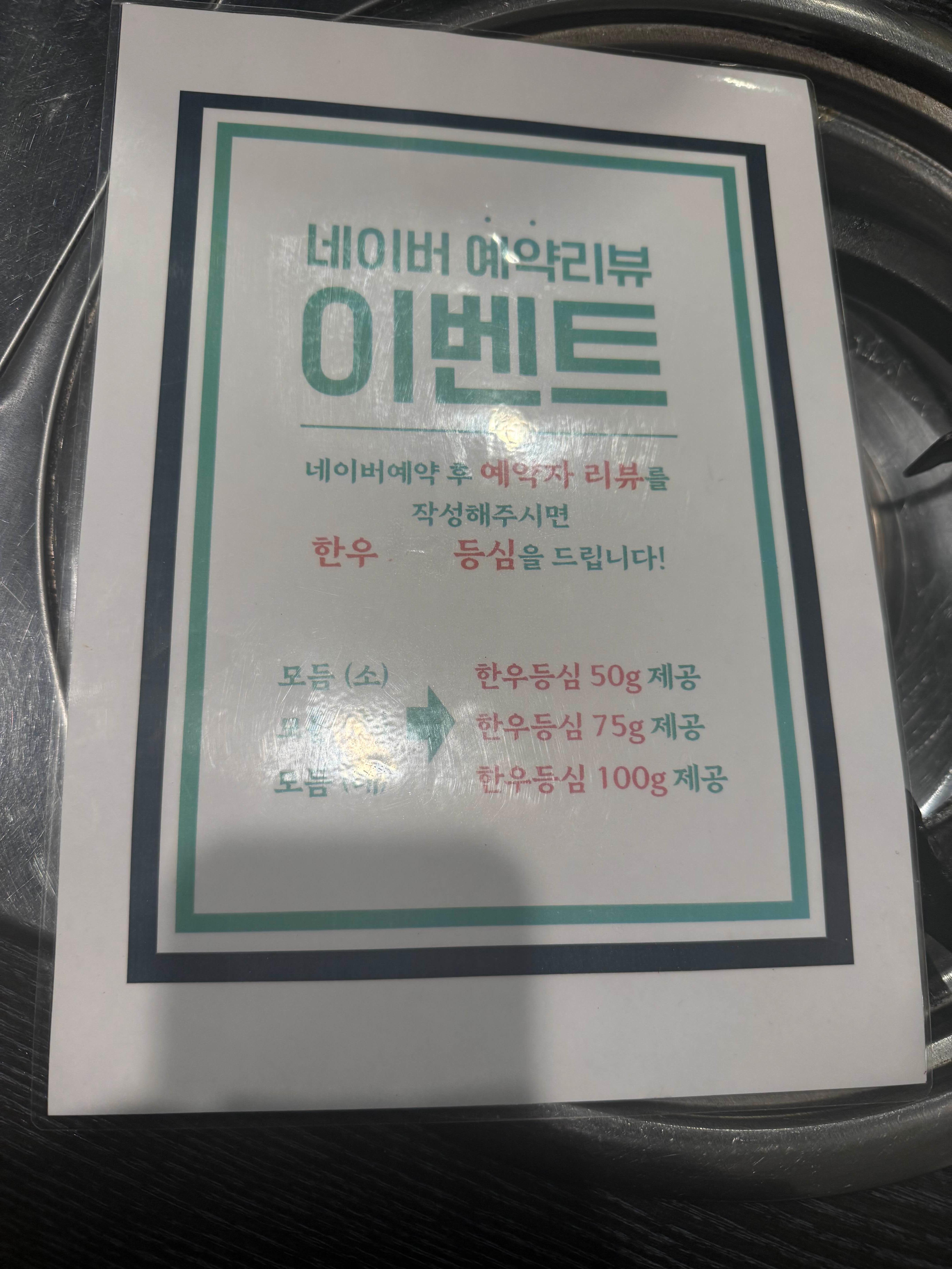 예약자 리뷰를 작성하면 모듬 주문 시 한우 등심이 제공됩니다.!