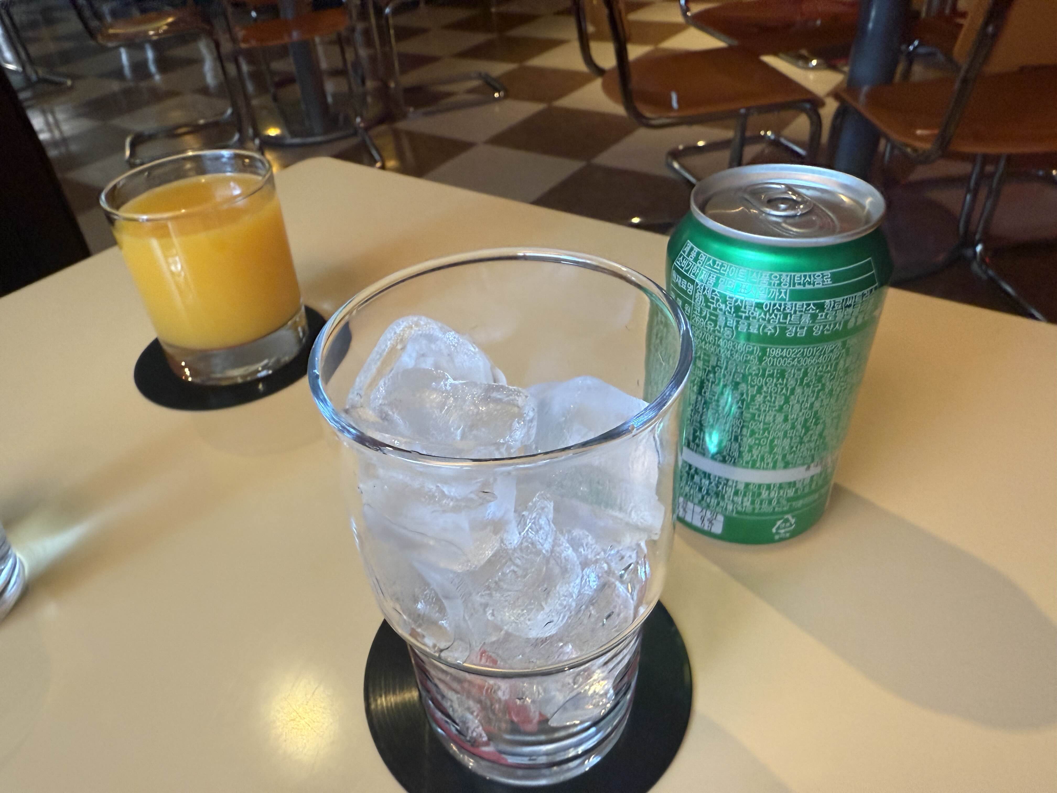 스프라이트와 얼음컵, 과육이 씹히는 착즙 오렌지주스는 비타민뿜뿜이예요.