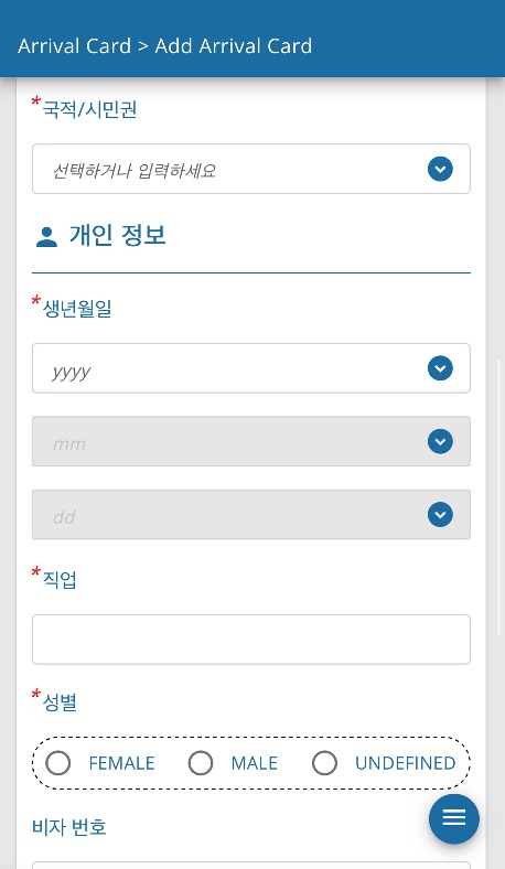 신고서 작성 후에 수정을 해야하는 경우 입국카드 업데이트를 선택하면 되겠섭니다.