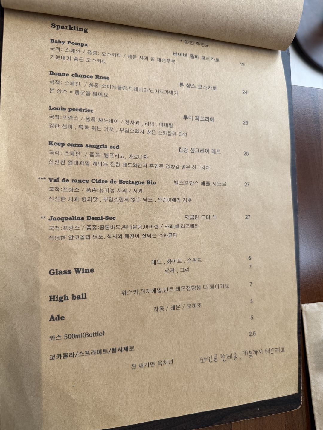 부채살 스테이크와, 잠봉나라 생면, 그리고 알쓰인 점을 고려하여 스파클링와인(baby pompa)을 보틀로 주문했어요.